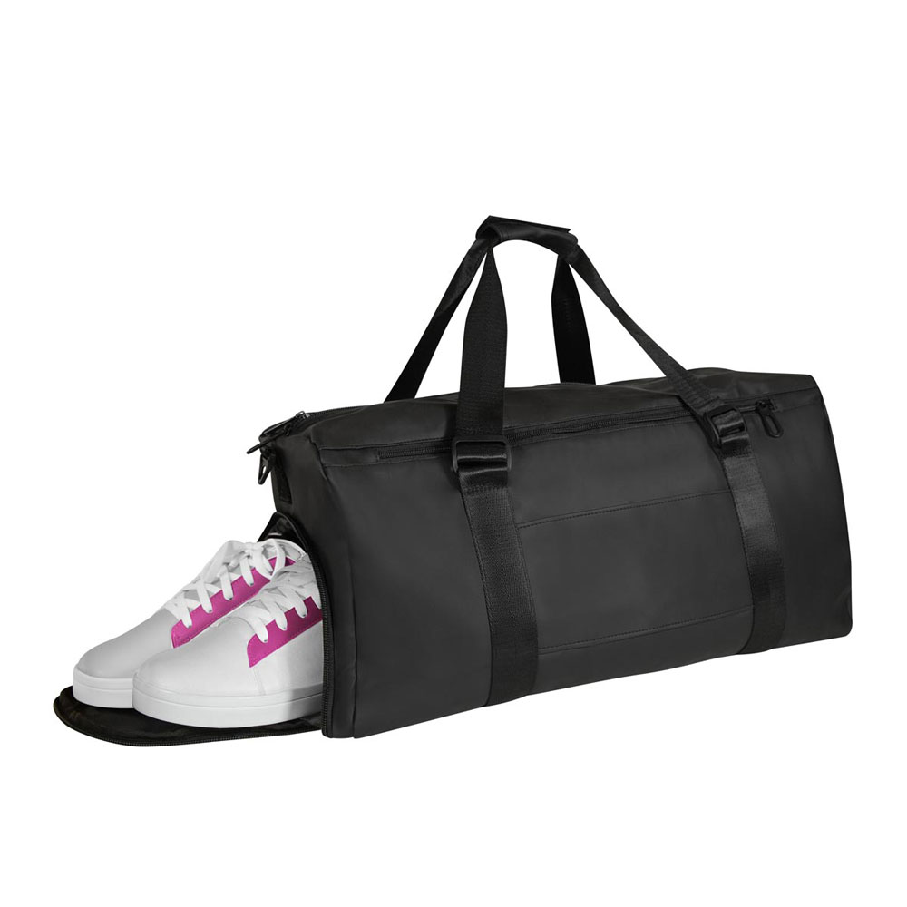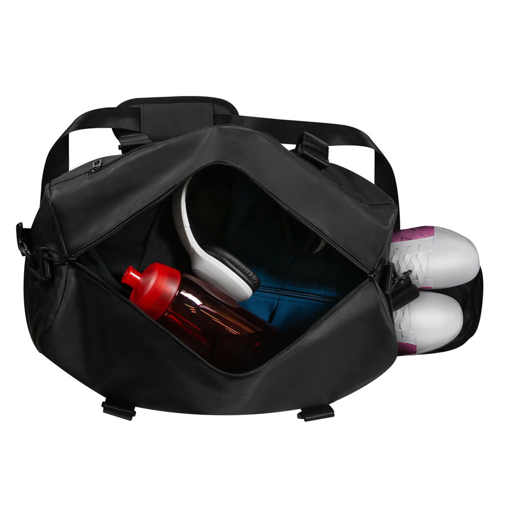 Maleta con diseño deportivo ideal para viajes o entrenamientos. Cuenta con un compartimento principal con cierre, un compartimiento interno también con cierre y otro bolsillo interno simple, para una mejor organización. Incluye un bolsillo lateral con compartimento para calzado y un bolsillo trasero con forro.
