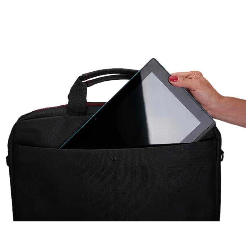 Maletín porta laptop de 2 compartimentos exteriores y vivos en color rojo o azul. Para laptop de hasta 16 pulgadas. Cuenta con soporte acolchado para protección de la computadora, compartimento para credenciales y bolígrafos , asas superiores de transporte, correa ajustable y banda en la parte trasera para sujetarse sobre la maleta de viaje.