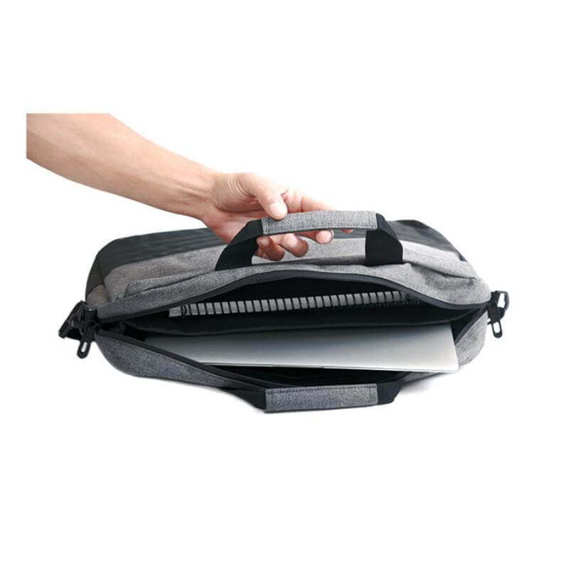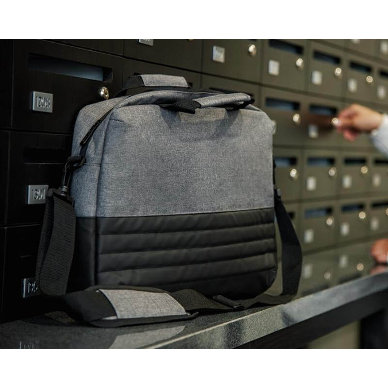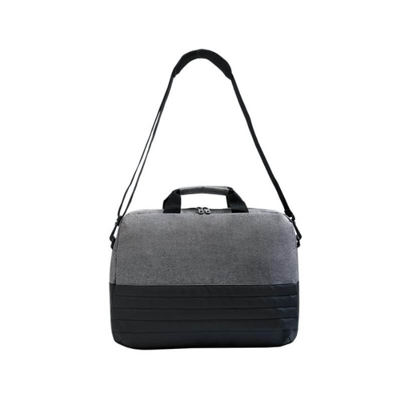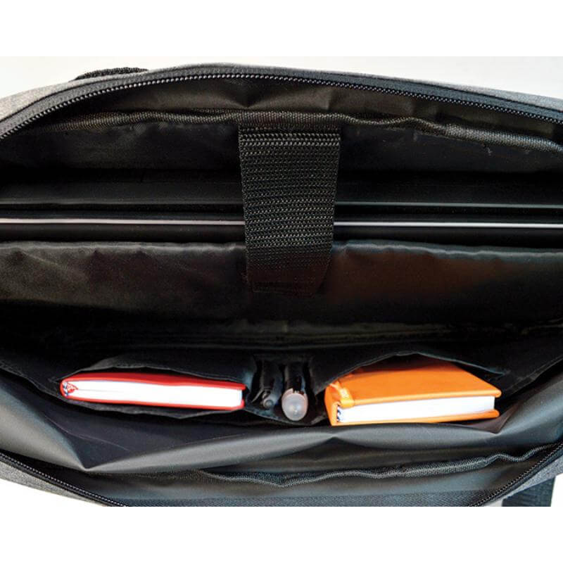 Maletín porta laptop de 15.6 pulgadas con diseño tipo curpiel con interior acolchado y compartimentos para accesorios. Correa larga ajustable y asas. Banda para sujetarse sobre maleta de viaje.