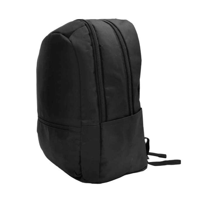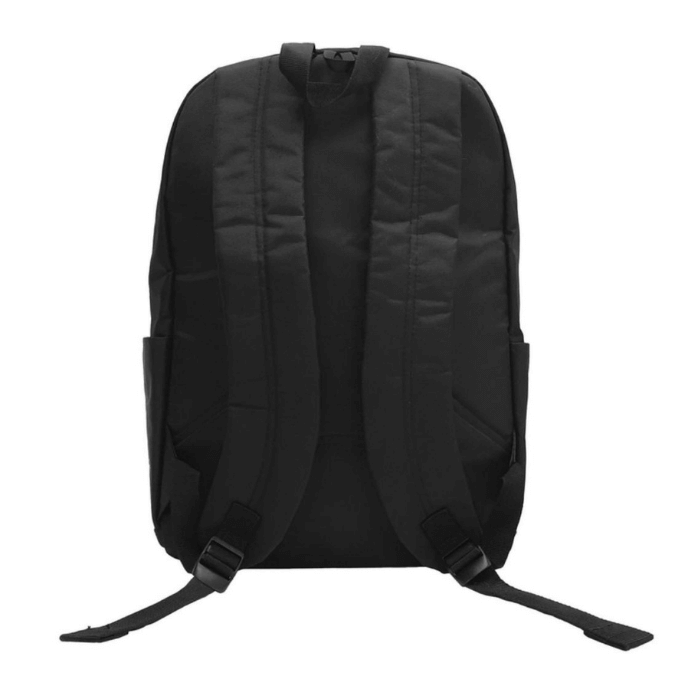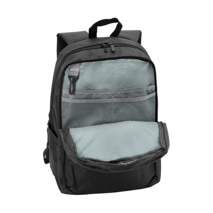 Mochila Portanotebook de hasta 16″. Bolsillo frontal con cierre y dos bolsillos laterales para botella o Mug. Dos compartimentos con cierre. Compartimento principal con bolsillo porta notebook y documentos. Compartimento intermedio con cuatro bolsillos pequeños y gancho plástico en su interior. Estructura, espalda y correas acojinadas. Tiradores de cierres metálicos en color negro. Capacidad 25 litros. Poliéster 600D.