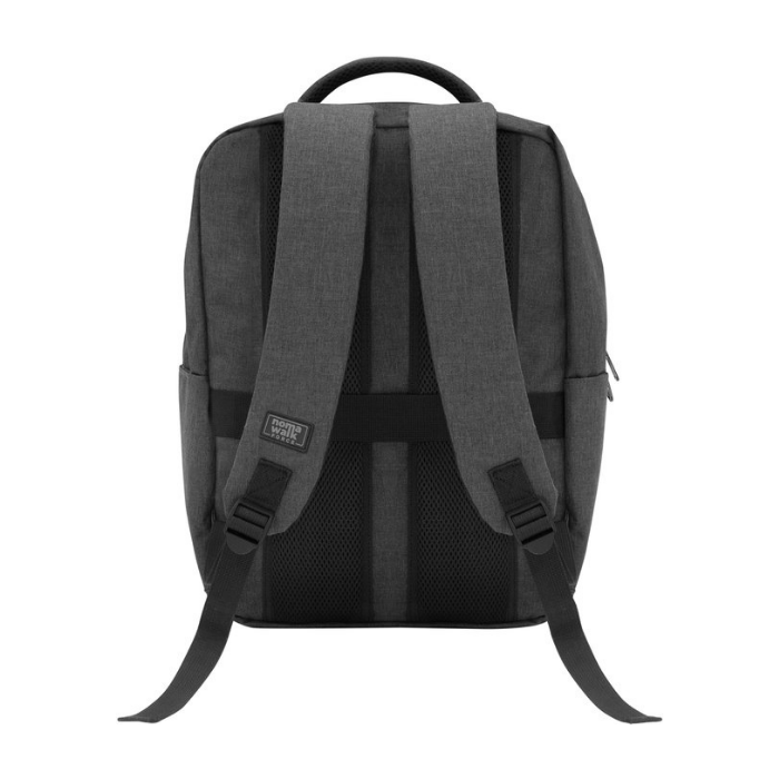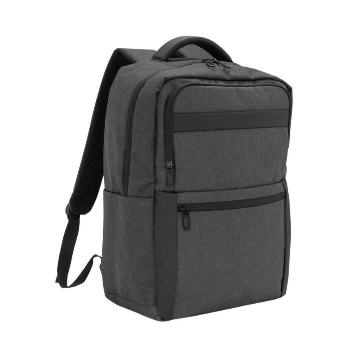 Mochila portanotebook de hasta 17 pulgadas. Cuenta con dos compartimentos, el compartimento principal con bolsillo acolchado para la notebook. Frente con bolsillo horizontal con cierre y dos bolsillos laterales. Asa superior reforzada, correas ajustables y respaldo con red que permite ventilación, todos acolchados. Tiradores de cierres metálicos color negro. Capacidad 19 litros. Poliéster wulong 300D. Interior forrado en 210D. Detalles en PVC color negro.