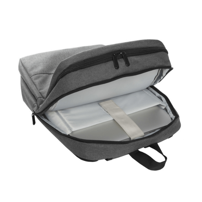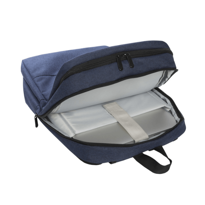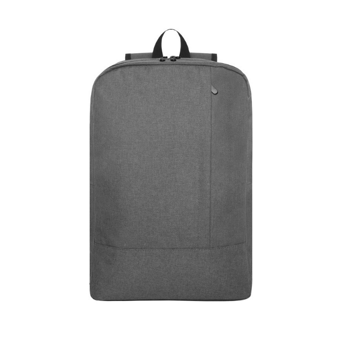Mochila portanotebook de hasta 16 pulgadas. Amplio bolsillo frontal con cierre lateral. Posee 2 compartimentos acojinados y forrados. El primero con un bolsillo de red con cierre, organizador con pequeños bolsillos, porta boligrafos y espacio para guardar una tablet. El segundo compartimento contiene bolsillo para notebook de hasta 15″. Correas ajustables y espalda acojinadas con tela de red que permite la ventilación. Tiradores de cierres metálicos. Capacidad 14 litros aprox. Tela de yute – imitación. Poliéster 100%.