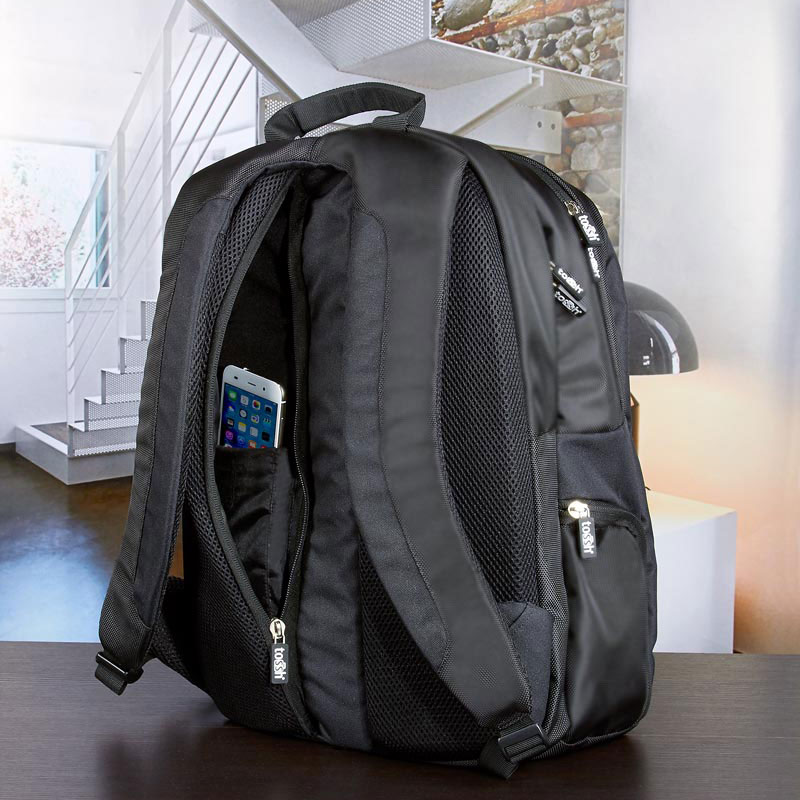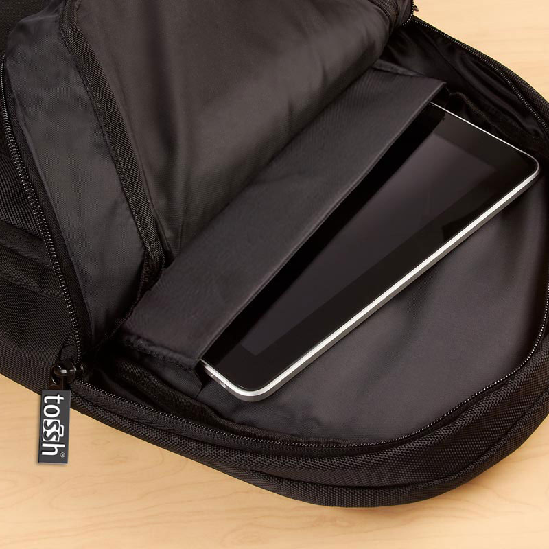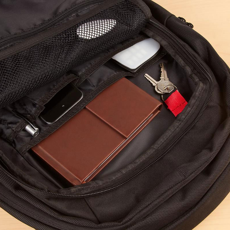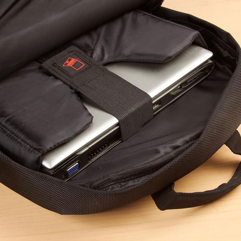 Bolsa principal con cierre y espacio para laptop de 15”. Bolsa central para tablet. Bolsa frontal con compartimentos para celular, Bolígrafos y documentos. Bolsas laterales con cierre. Respaldo con cierre y porta celular interno. Respaldo y tirantes acojinados. Compartimento inferior con funda impermeable para la mochila. Incluye porta llaves.