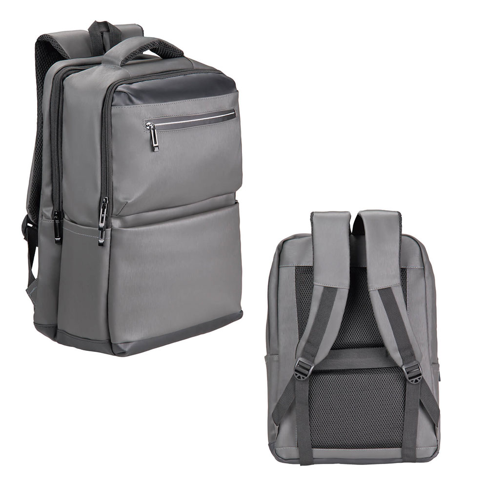 Mochila con compartimento principal con organizador interno y bolsa con cierre, compartimento trasero con porta laptop de 16.5″, dos bolsas frontales con cierre, dos bolsas laterales, respaldo acolchado con banda carry-on y asa superior.