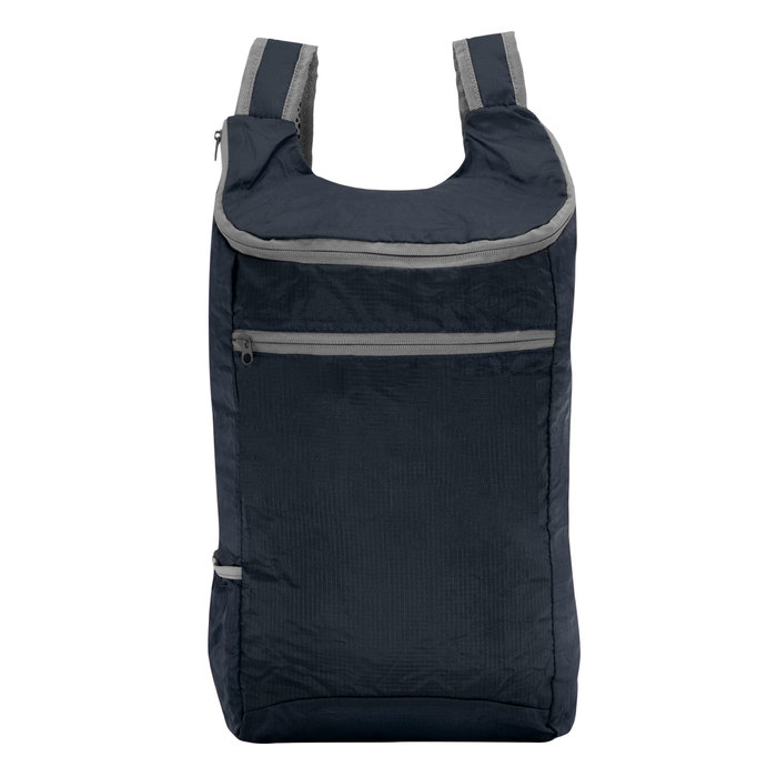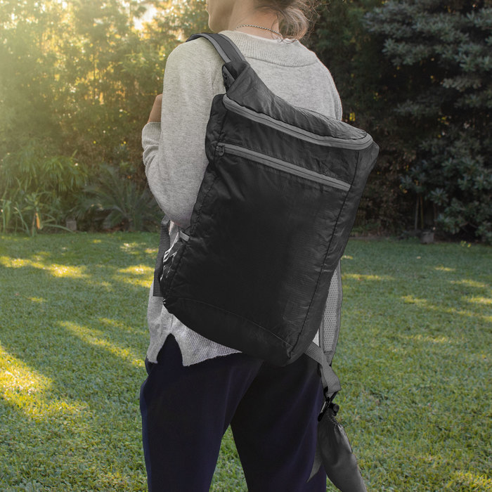 Mochila plegable. Compartimento principal con cierre. Bolsillo lateral elastizado. Bolsillo frontal con cierre horizontal. Cierres metálicos. Correas regulables reforzadas y acolchadas. Se comprime fácilmente en una bolsa pequeña con cierre ajustable. Capacidad 13 litros. Ripstop 210T (Tela ligera y resistente, de alta durabilidad y protección antidesgarro).