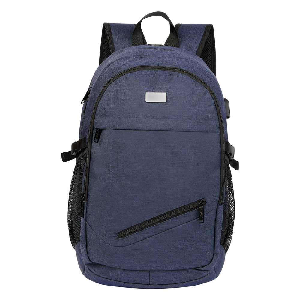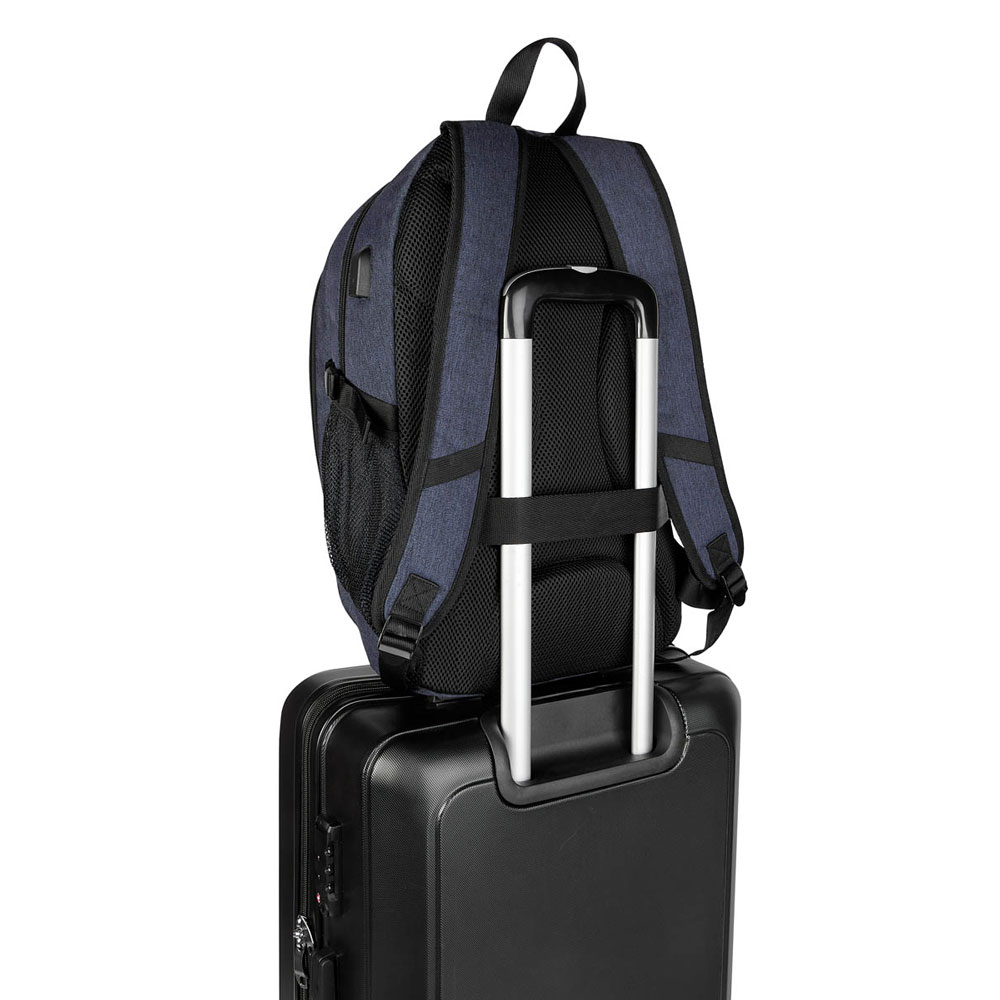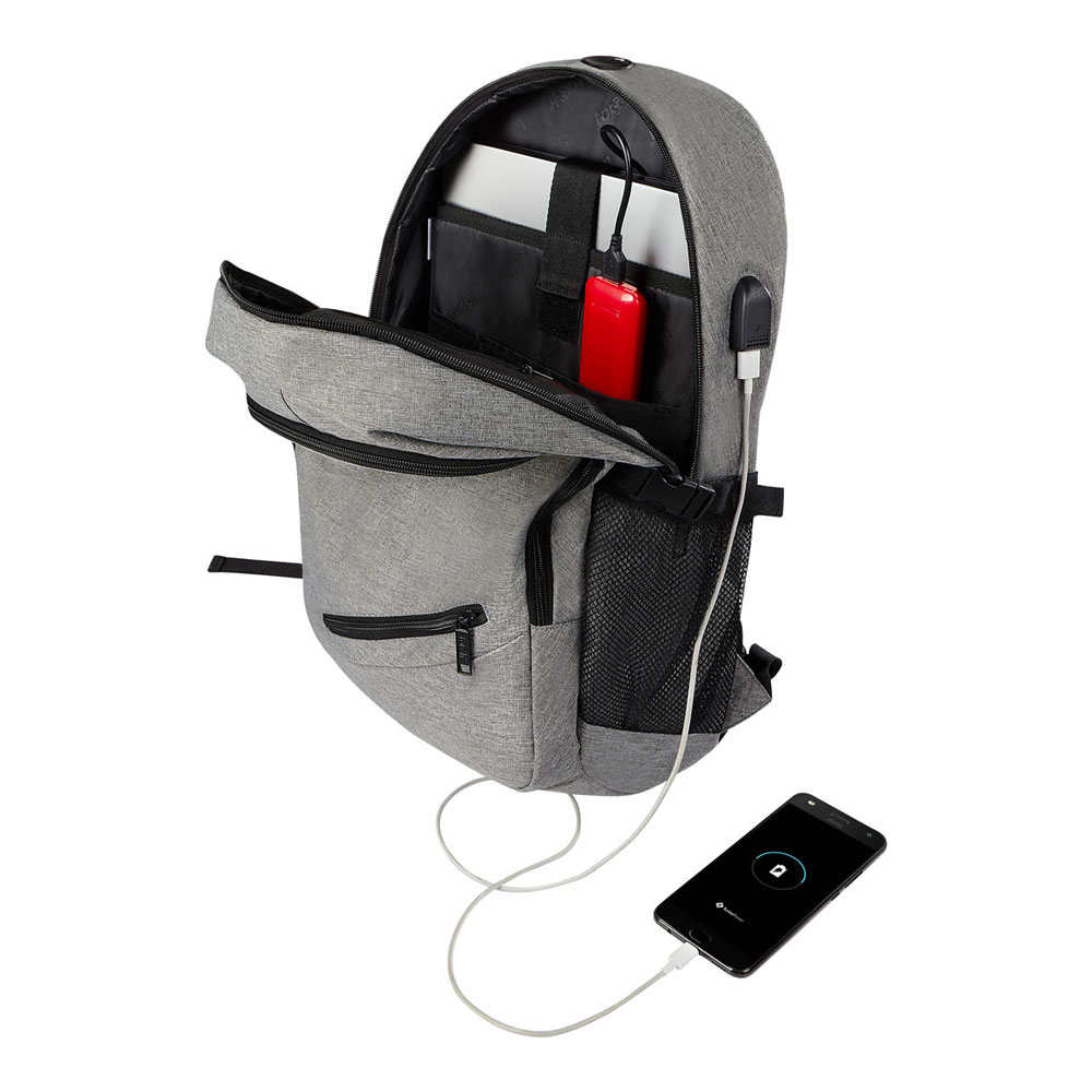 Mochila con salida USB (se requiere conectar a batería portátil) para cargar smartphone. Bolsa principal con espacio para laptop de 17″ y tablet. Bolsa frontal con organizador y 2 bolsas frontales con cierre. 2 Bolsas laterales de red con broches ajustables de plástico. Salida para audífonos. Aditamento especial trasero para poner en trolley. Placa metálica removible para fácil grabado. Respaldo y tirantes acojinados.