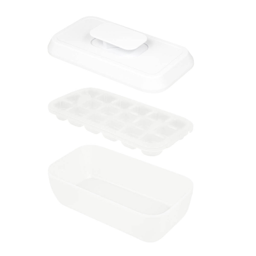 Molde para hielos con almacenamiento integrado. Crea hasta 18 cubitos y desmoldalos fácilmente con el sistema push de la tapa. Gracias a su contenedor integrado, puedes almacenar el hielo listo para usar sin ocupar espacio extra.