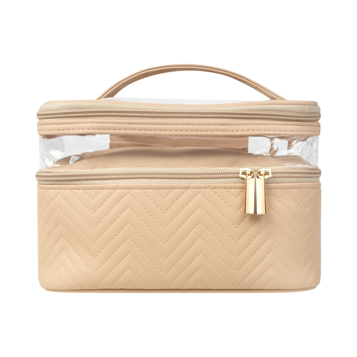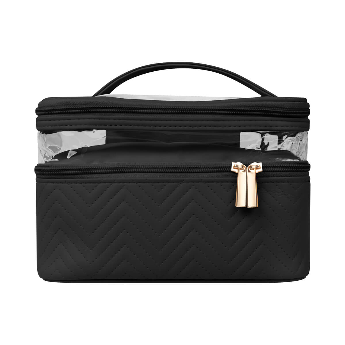 Neceser fabricado en PU con cuerpo semirrígido. Cuenta con dos niveles con cierre, ideales para organizar y separar productos de belleza o higiene personal. Su panel superior de mica transparente permite visualizar el contenido fácilmente, mientras que el asa facilita su transporte. Ideal para guardar productos de belleza, cuidado personal o maquillaje.