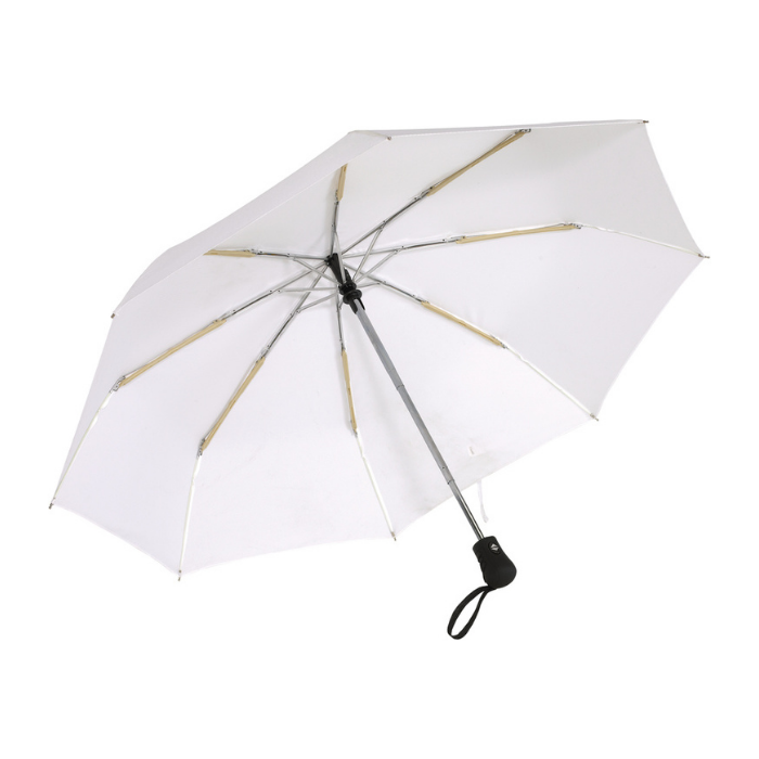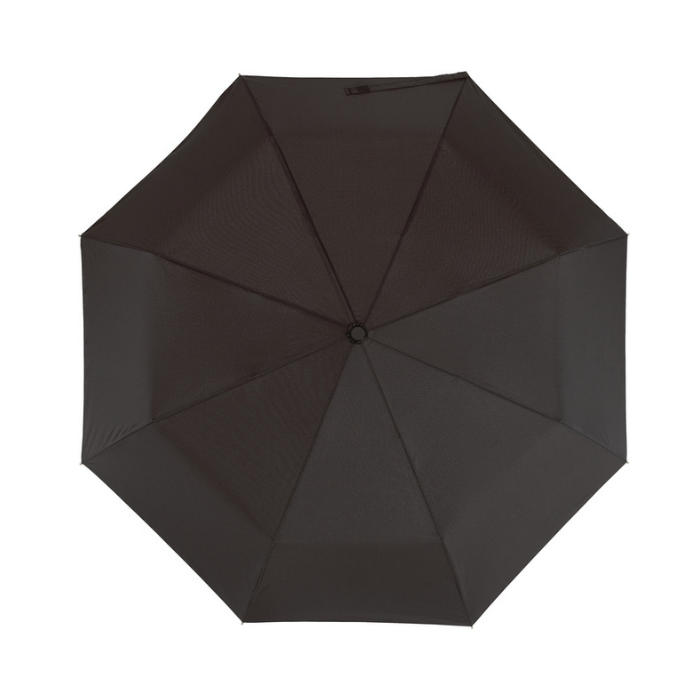 Paraguas APERTURA Y CIERRE AUTOMÁTICO. Eje y varillas metálicas. Mango de plástico engomado con correa cordón color negro. Botón a presión. Cubierta y funda en poliéster-pongee con revestimiento especial hidrófugo. Cierre con correa de velcro. 8 gajos. Ancho gajo 37 cm. Largo cerrado 28,5 cm. Largo abierto 55,5 cm. Poliéster, metal y plástico engomado.