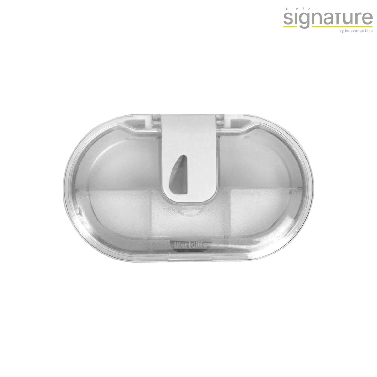 Pastillero con forma ovalada, fabricado en plástico AS (acrilonitrilo estireno), con cortador de acero inoxidable y 5 compartimentos.
