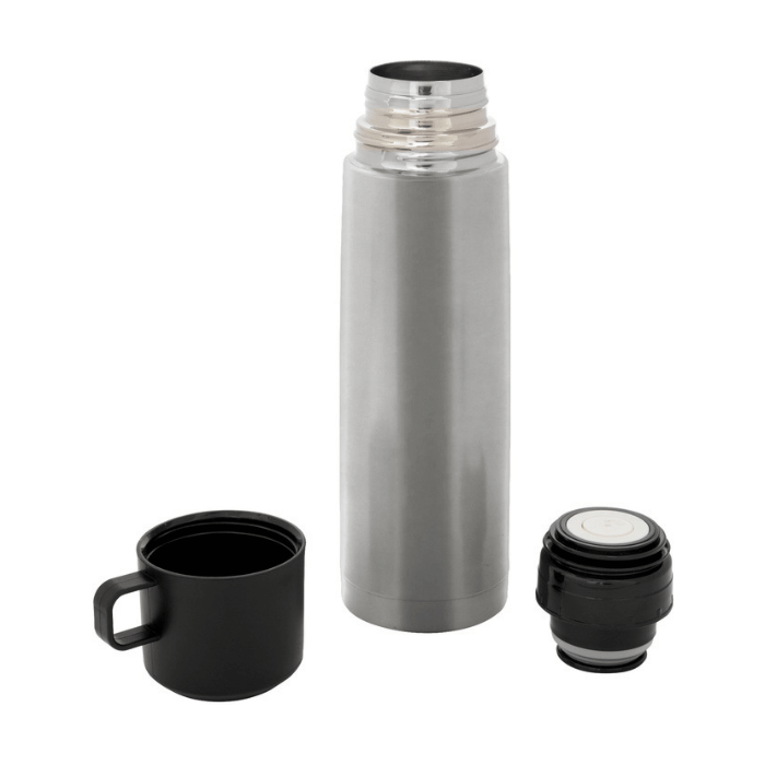 Termo con doble pared sellado al vacío. Tecnología vacuum. Acero inoxidable 304 interior / 201 exterior. Tapa y taza plásticas en color negro. Pintura acabado mate. Mantiene hasta 6 hs la temperatura de las bebidas calientes y 12 hs de las bebidas frías.