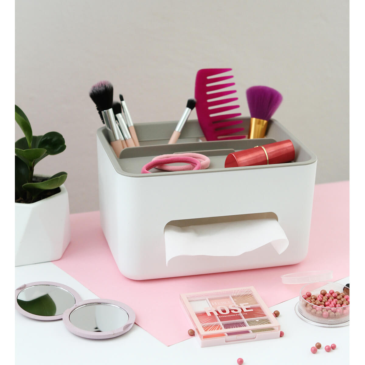 Porta pañuelos desechables con porta celular y compartimentos para almacenaje, fabricado en plástico PP. Es ideal para almacenar varios artículos de papelería o personales. La solución perfecta para organizar y llevar tus artículos de papelería o personales de manera ordenada y conveniente.