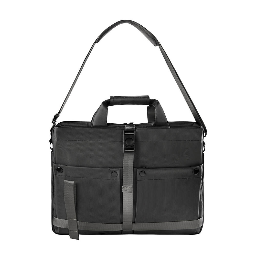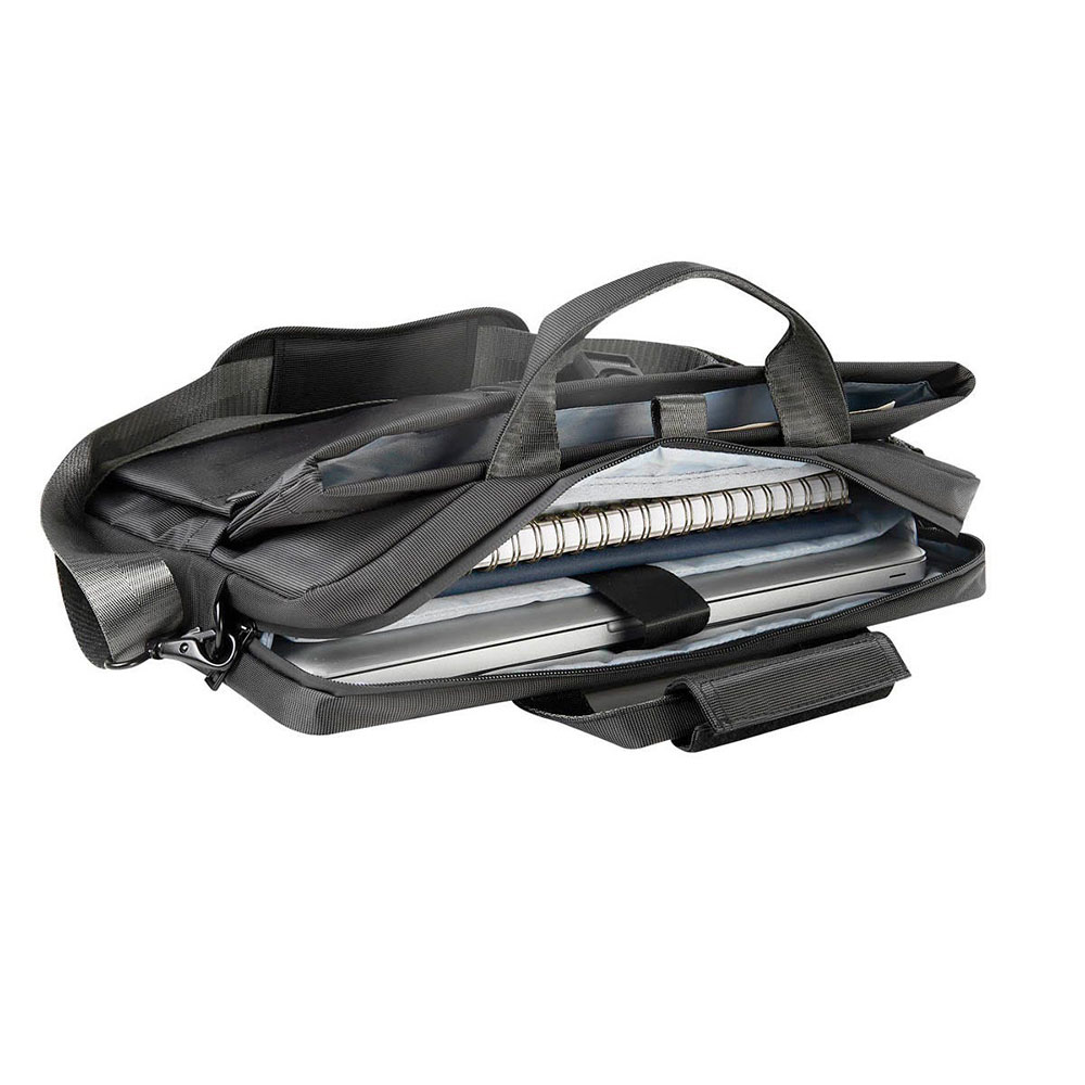 Portafolio ejecutivo con múltiples bolsillos organizadores, ideal para llevar todo lo necesario en un solo accesorio. Su bolsillo principal con cierre, permite guardar una laptop de hasta 15». Bolsillo frontal, con cierre de velcro y broche de plástico, ideal para mantener seguras tus pertenencias de valor, ademas de dos bolsillos para objetos mas pequeños. Asa superior que se une por medio de velcro y un asa removible para hombro con broches metálicos. En la parte posterior, contiene una banda para transportar fácilmente en trolley.