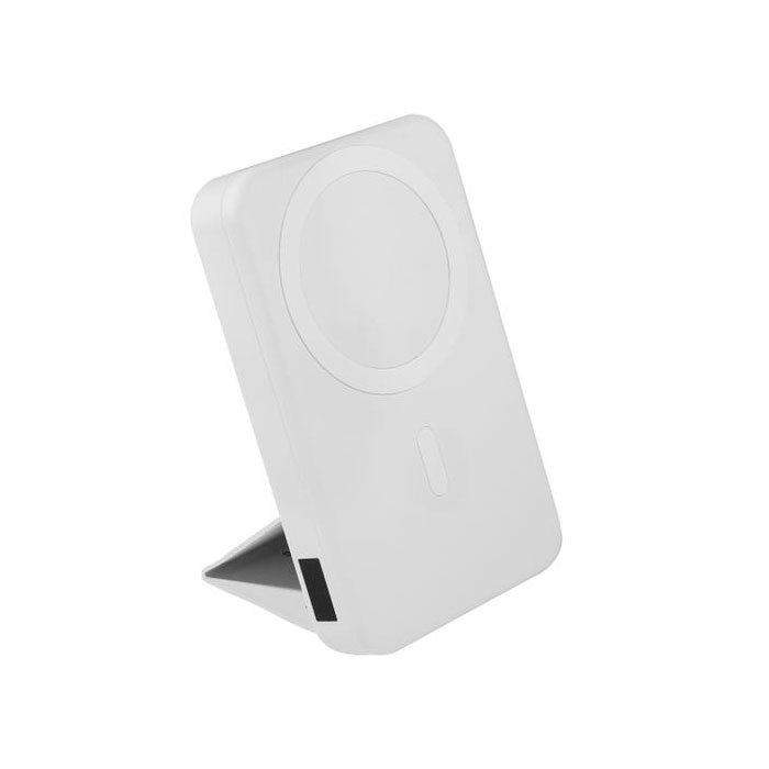 Batería auxiliar para smartphone de 5,000 mAh, con terminado rubber y cargador inalámbrico magnético. Incluye solapa plegable con puntas imantadas que funciona como soporte. Cuenta con un puerto USB y un puerto tipo C, con salida de 7.5W / 10W / 15W. Incluye botón de encendido, display indicador de carga, cable cargador tipo C y caja individual.