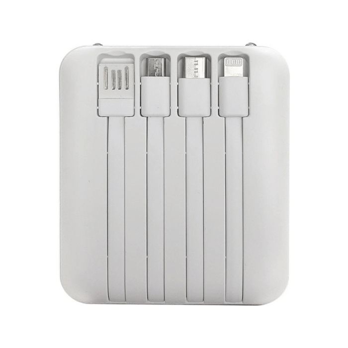 Powerbank multipuerto. Pantalla digital. Doble salida USB. Entradas micro-USB y USB tipo C. Salida de carga rápida 2A. Linterna dual led. 4 cables de carga integrados: USB, Micro USB, Tipo C y IPhone. Puede cargar hasta 5 dispositivos al mismo tiempo. Presentación en caja de regalo. Capacidad: 5000 mAh. Plástico ABS acabado mate.