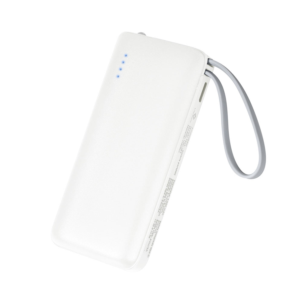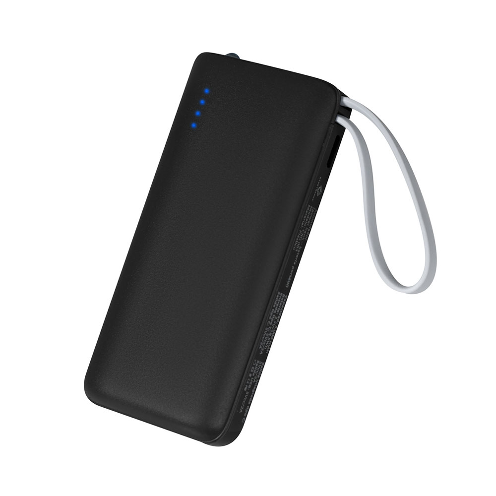 Batería auxiliar para smartphone, capacidad 5,000 mAh. Contiene 1 puerto de entrada tipo C para carga de la batería y 1 puerto de salida USB para carga de dispositivos. Adicional 1 cable integrado tipo C. Incluye Lámpara con luz LED, display indicador de carga, cable con conector tipo C y caja individual.