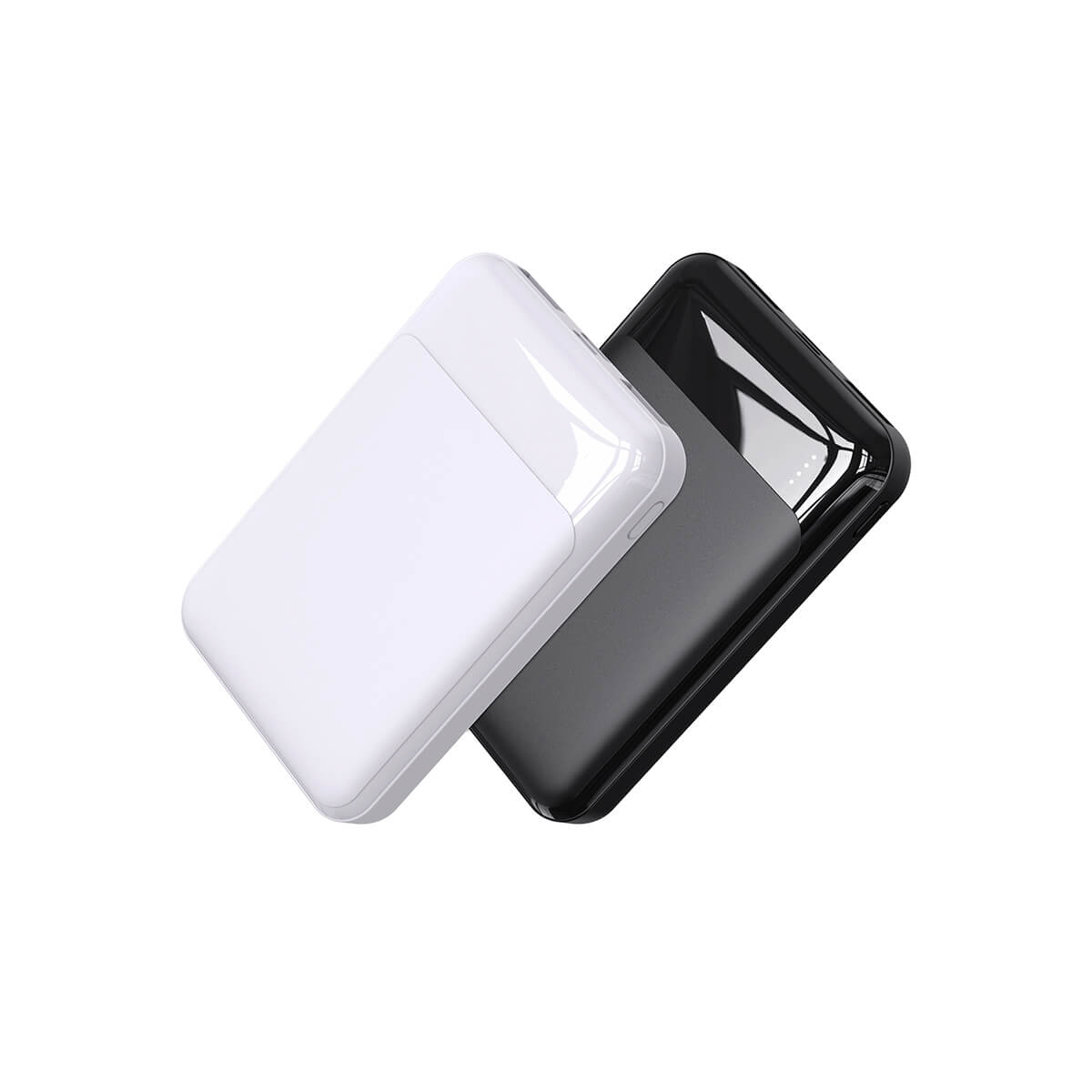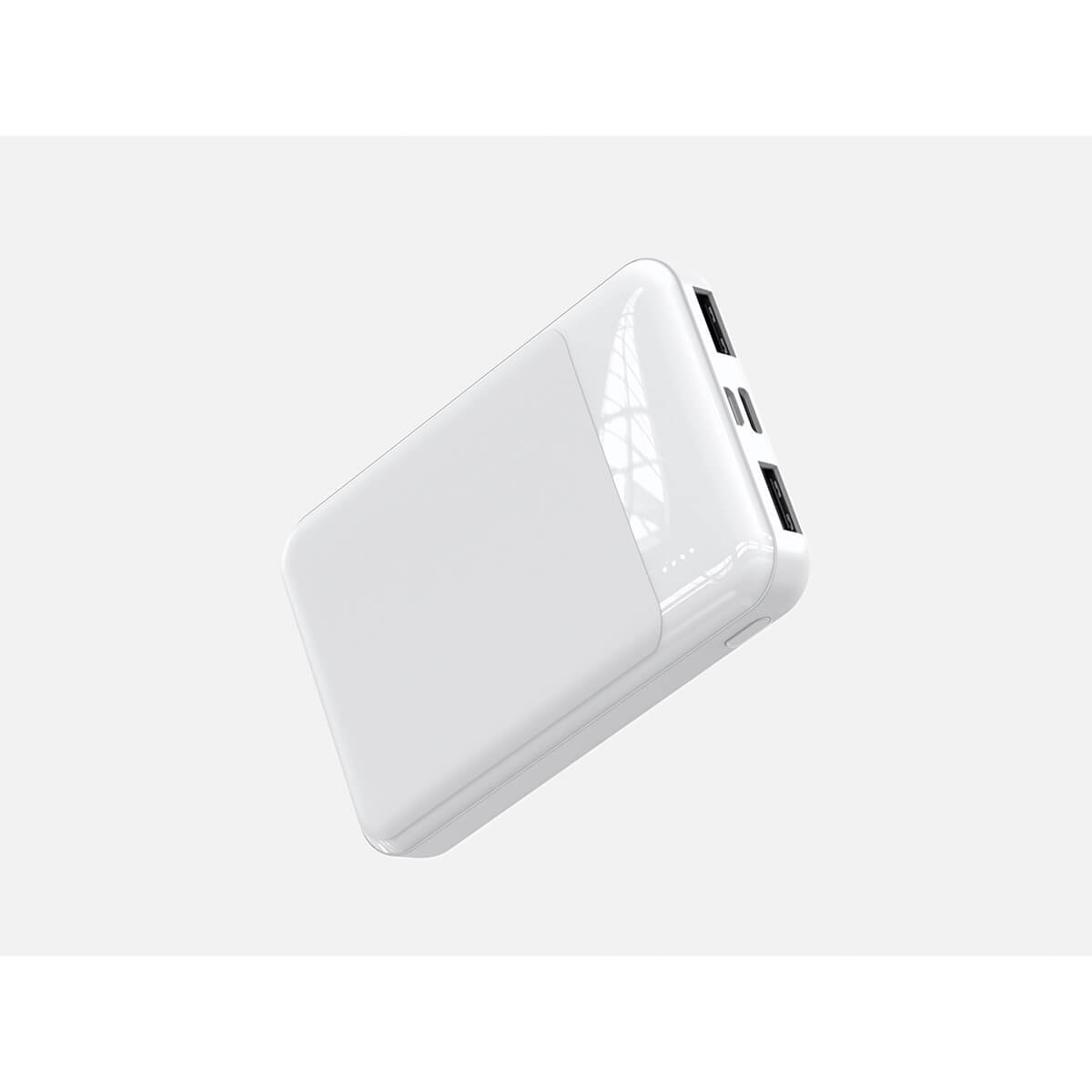 Power bank fabricada en plástico ABS con 1 salida tipo C, 1 salida micro USB y 2 salidas USB. Batería de polímero de litio de 5,000 mAh. Incluye cable USB para carga y caja de cartón individual.