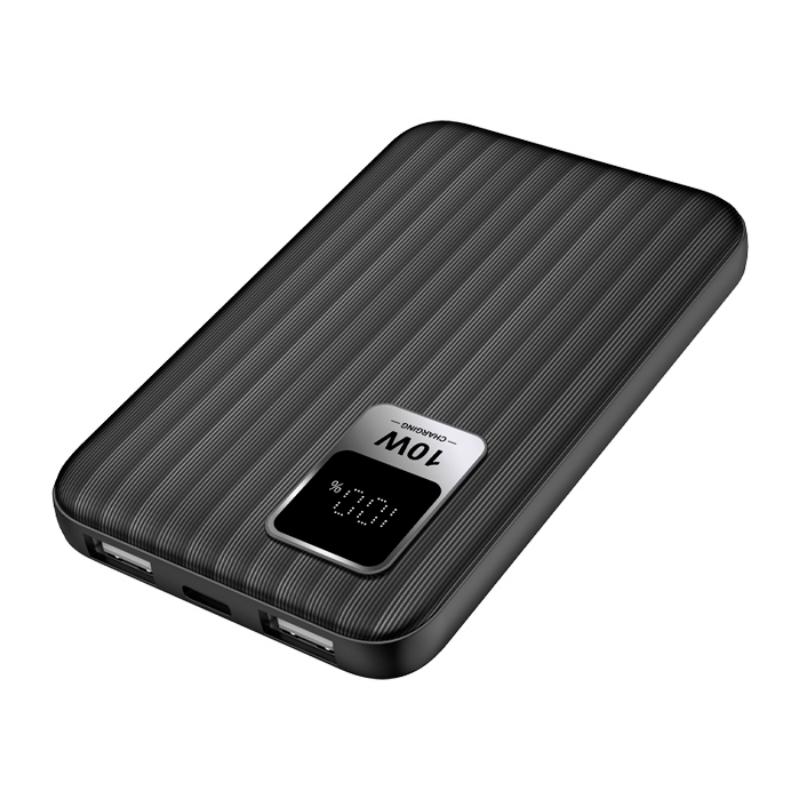 Mini batería portátil de carga rápida con capacidad de 5,000 mAh (10 W). Cuenta con pantalla digital que indica el porcentaje de la batería, entrada de carga tipo C (Incluye cable de carga), 2 puertos de carga de entrada – salida USB, botón de encendido y apagado automático. Presentación: Caja de regalo a color.