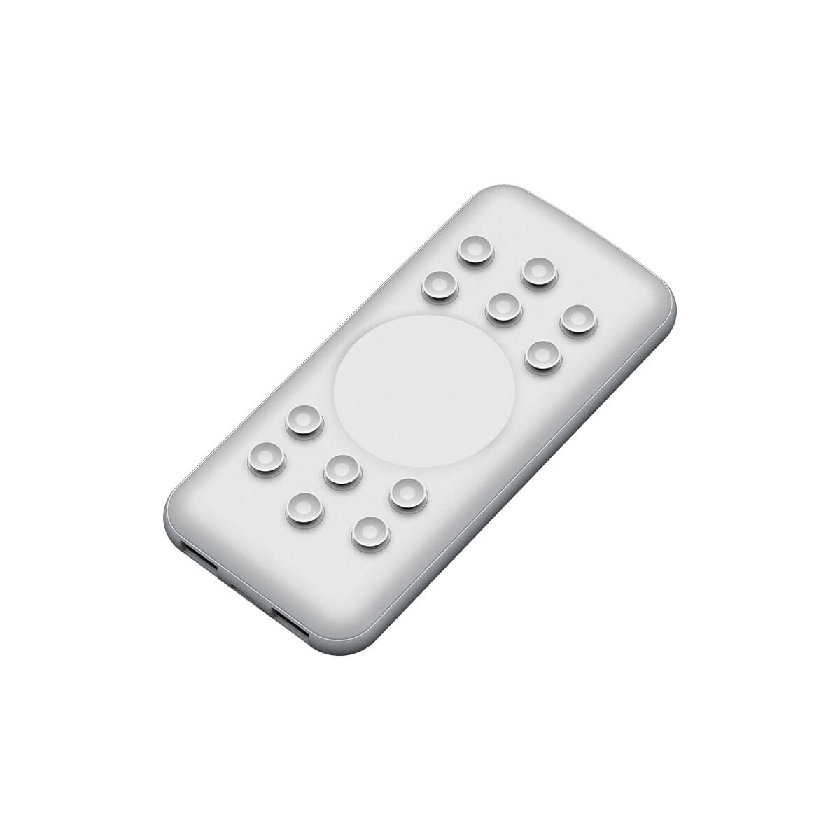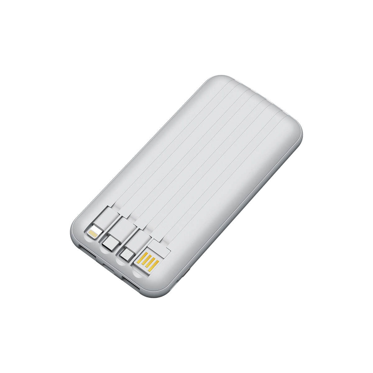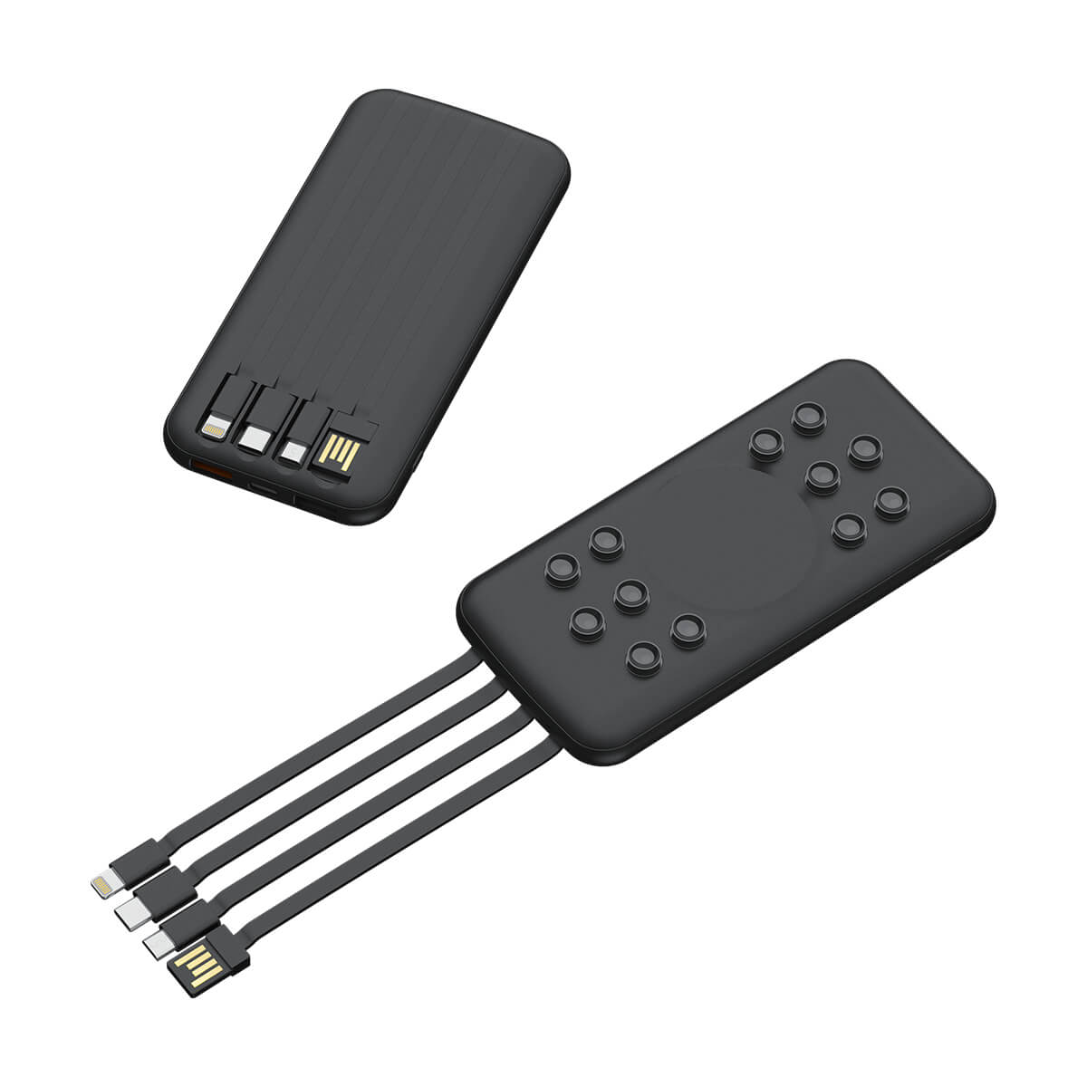 Power Bank de 10,000 mAh, fabricado en plástico ABS, con 4 cables de carga integrados, en la parte inferior se encuentran 3 entradas para conectarla, ya sea a cargar o conectar otro tipo de entrada, tiene ventosas para adherencia en la superficie del dispositivo móvil que desee cargar. Incluye caja de cartón individual.