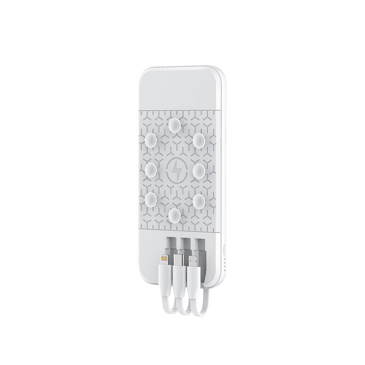 Con una capacidad de 10,000 mAh,  fabricada en plástico ABS, un material duradero y resistente, está equipada con ventosas en lu parte posterior (estas ventosas permiten adherir el power bank a la superficie de tu dispositivo móvil ), con una inclusión de 3 cables de carga integrados ( micro USB, USB-C y Lightning) compatible con dispositivos Apple y android.Incluye caja de cartón individualEl Power Bank Sissa es un compañero confiable para mantener tus dispositivos móviles cargados en cualquier momento y lugar.