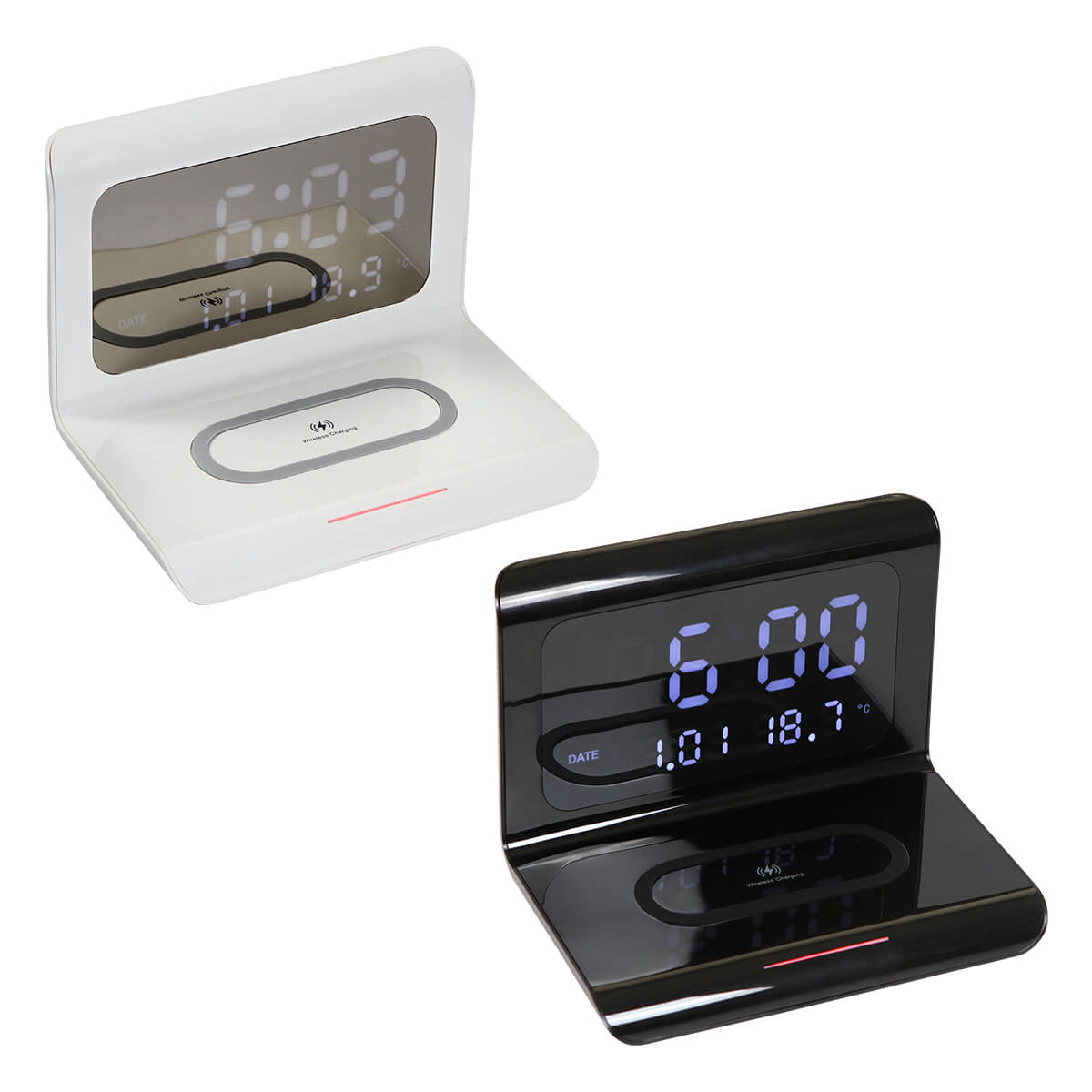 Reloj de escritorio digital con cargador inalámbrico, compuesto de ABS+Acrílico. Apto para dispositivos con tecnología Qi. Cuenta con varios espacios de carga lo que te permite cargar tu celular, audífonos y reloj al mismo tiempo.Incluye caja de cartón individual.