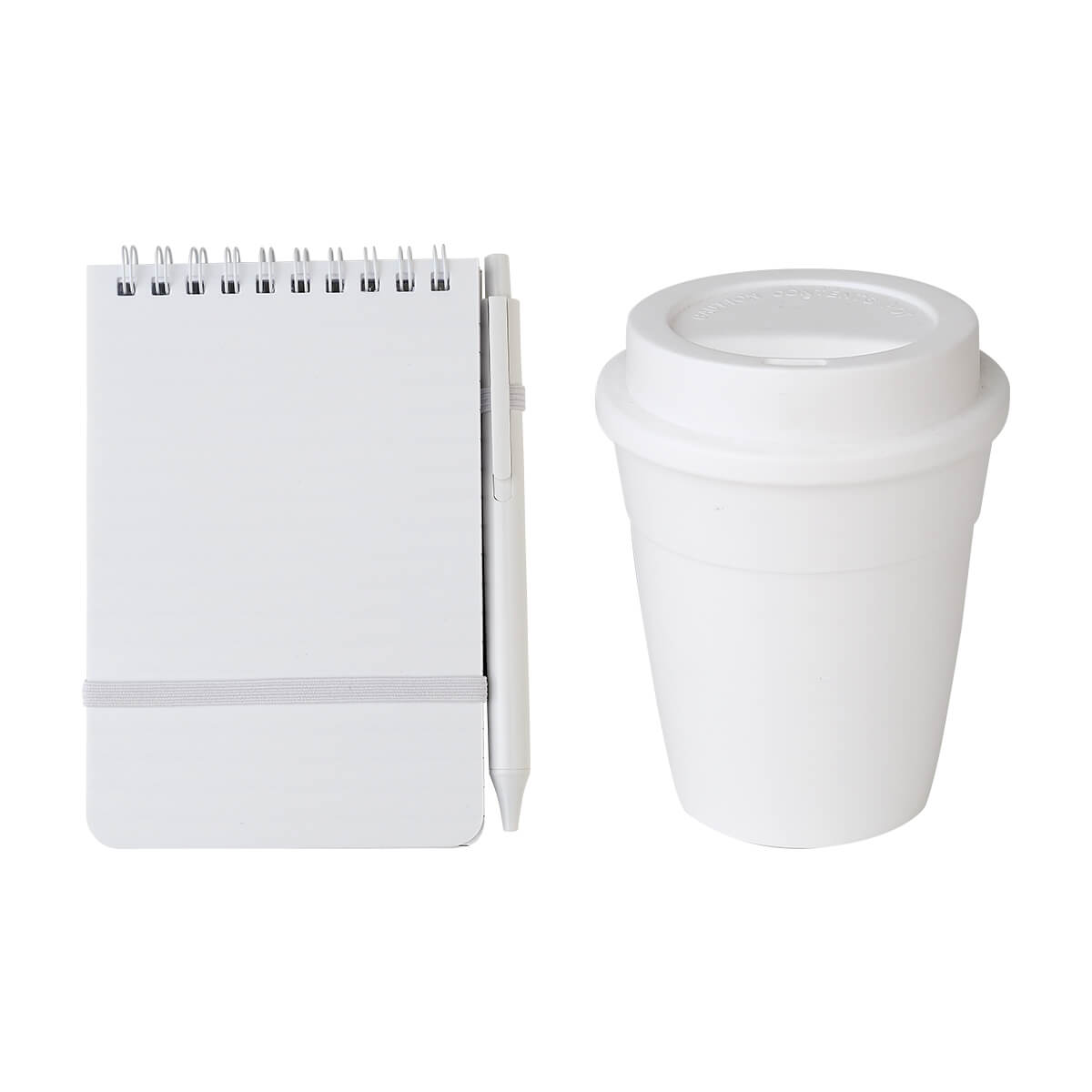 Set fabricado en ABS con material Antibacterial (iones de plata). Incluye vaso para café de 350ml, mini libreta para notas y bolígrafo de tinta negra. Fabricado en material Antibacterial con certificación ISO 22196 que inhibe hasta en un 99.9% el crecimiento y multiplicación de bacterias. El aditivo tiene como base los iones de plata, tecnología que que ha sido reconocida y utilizada durante siglos y que no tiene efectos dañinos. Incluye caja de cartón individual.