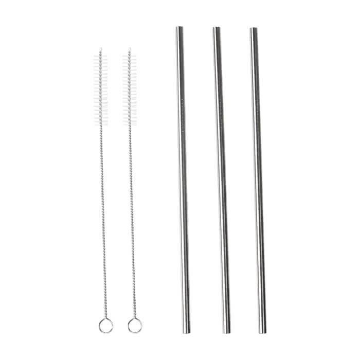 Set de 3 popotes de acero inoxidable reutilizables y 2 cepillos limpiadores con bolsa individual de tela de fácil cierre y apertura. Los popotes se pueden grabar y la bolsa cuenta con amplia área para impresión. Son ideales para viajar y responsables con el medio ambiente.