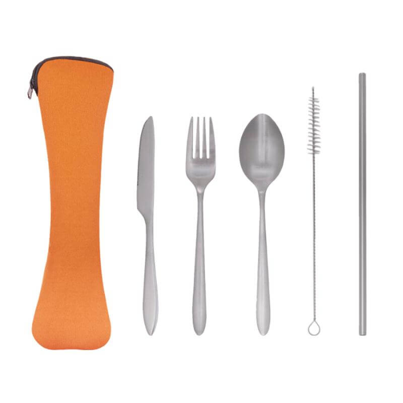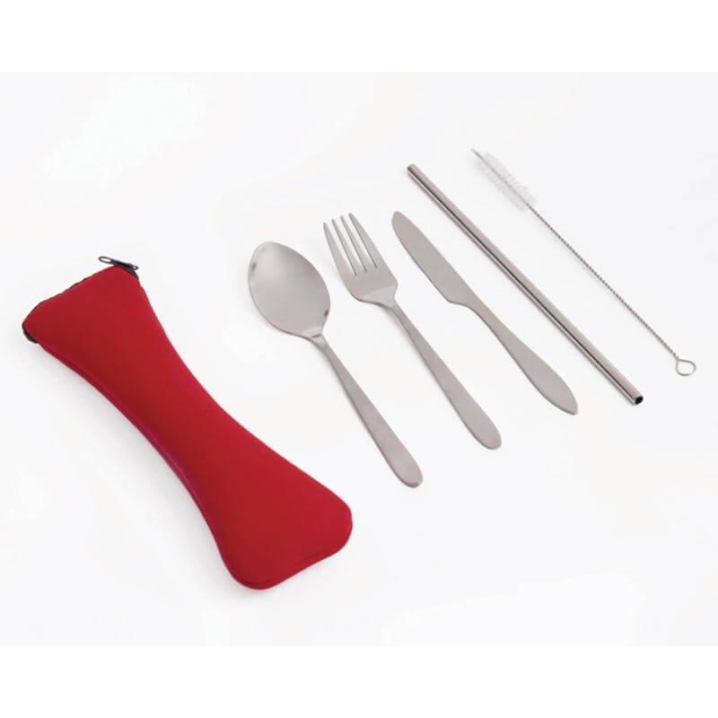 Estuche con cierre y cubiertos de acero inoxidable que incluye: tenedor, cuchara, cuchillo, popote y cepillo limpiador.