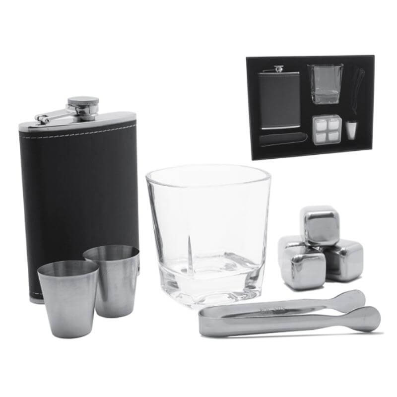 Set de licorera que incluye: Licorera de acero inoxidable de 8 OZ, embudo y 2 vasos metálicos para shots. Presentación: caja en color negro.