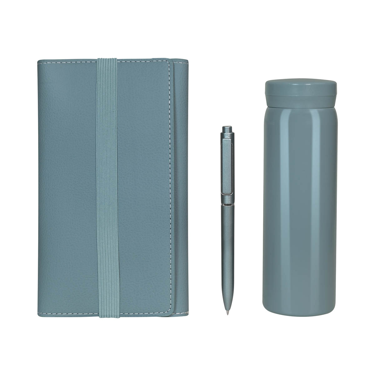 Set de regalo. Incluye: termo de doble pared metálica con tapa de plástico con sistema de rosca, capacidad 300 ml, bolígrafo de plástico con sistema push, libreta con pasta de curpiel suave con cierre de elástico y 70 hojas a rayas, al interior de la libreta incluye dos bloques de notas adhesivas y 5 banderines, además de agregar compartimentos para tarjetas o pequeños documentos.