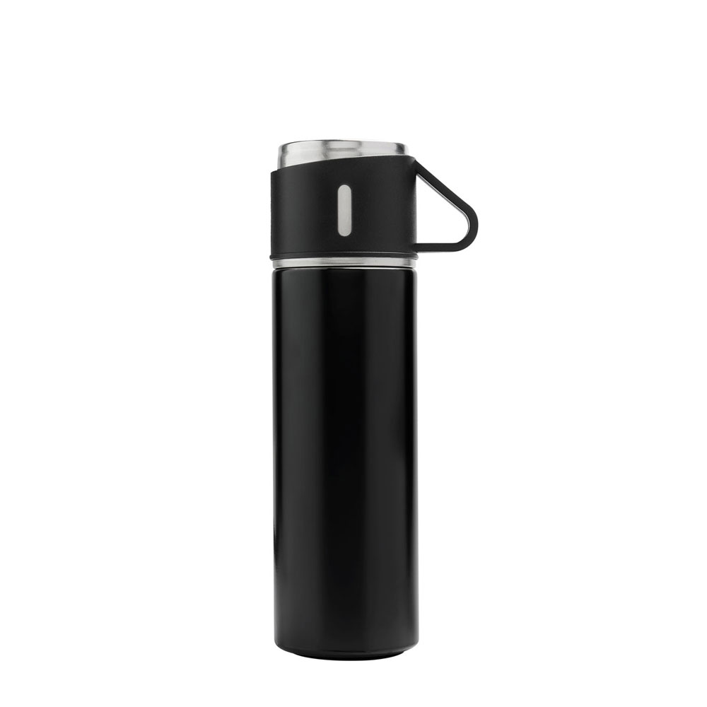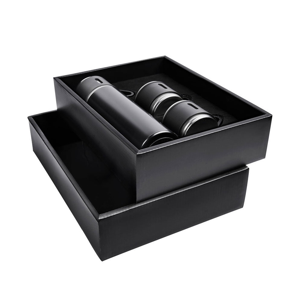 Set de regalo con 1 termo cuya tapa sirve como taza y 2 tazas adicionales. Termo doble pared cerrado al vacío, pared interna y externa de acero inoxidable, tapa interna de rosca con sistema push para verter fácilmente sin retirar el tapón, mantiene temperatura caliente 6 hrs y temperatura fria 8 hrs. Las tazas de acero inoxidable con un recubrimiento y asa de plástico. Incluye Caja de regalo.