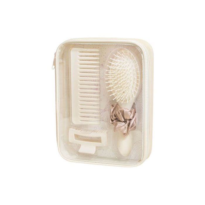 Tamaño: 2 x 25.5 x 6 cm Estuche / 15.8 x 6.2 cm Peine / 8.6 x 4.6 x 4.2 cm Pinza / 7 x 21.8 x 4.7 cm Cepillo / 9 cm diámetro Dona