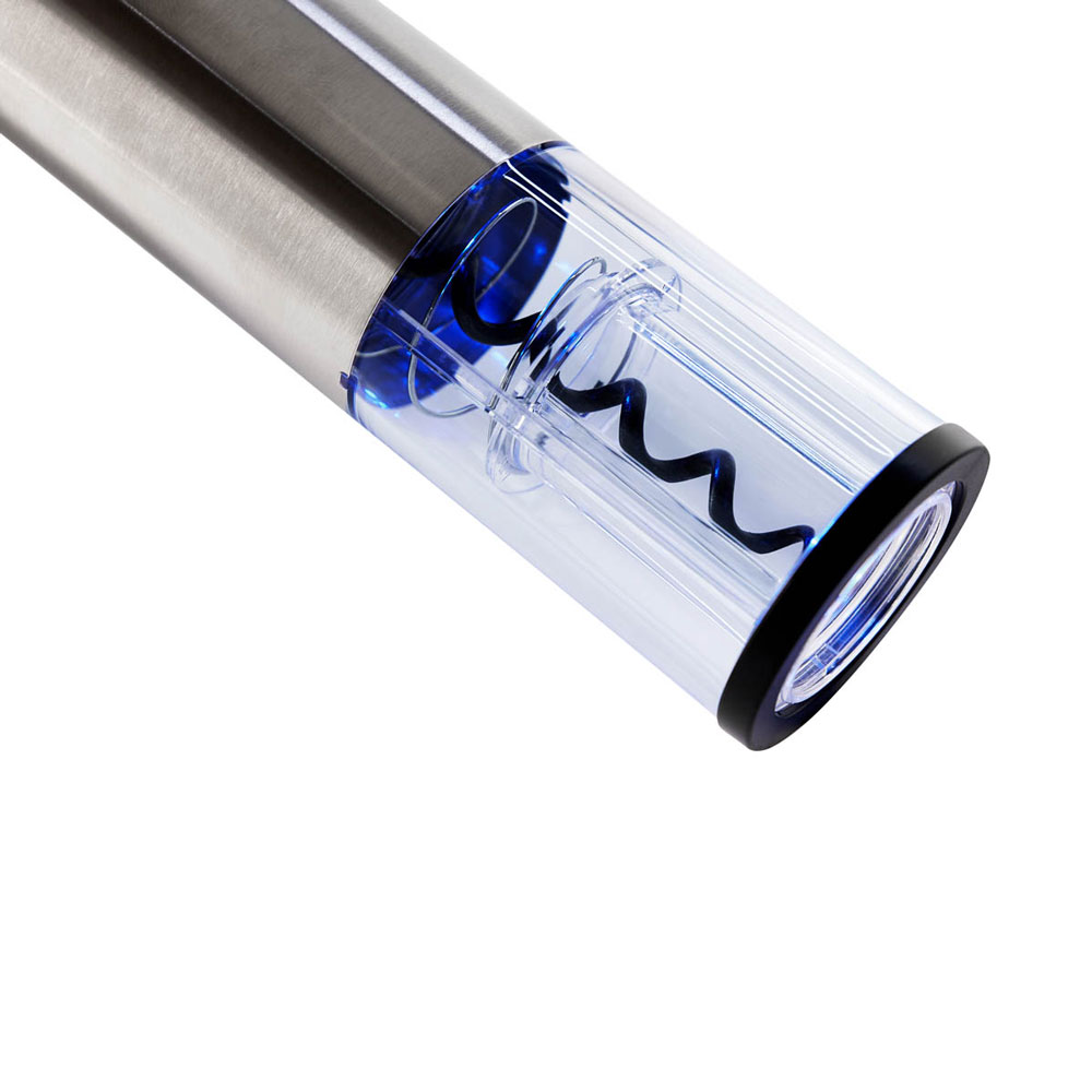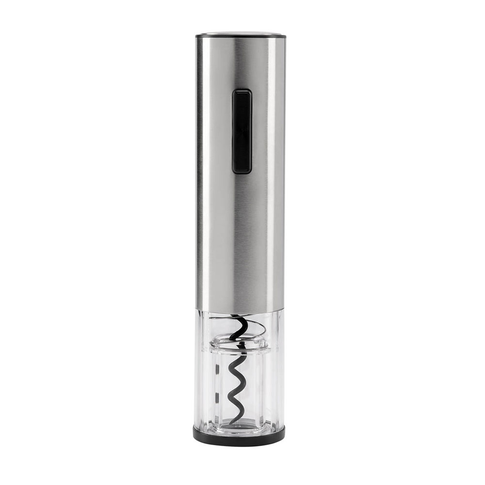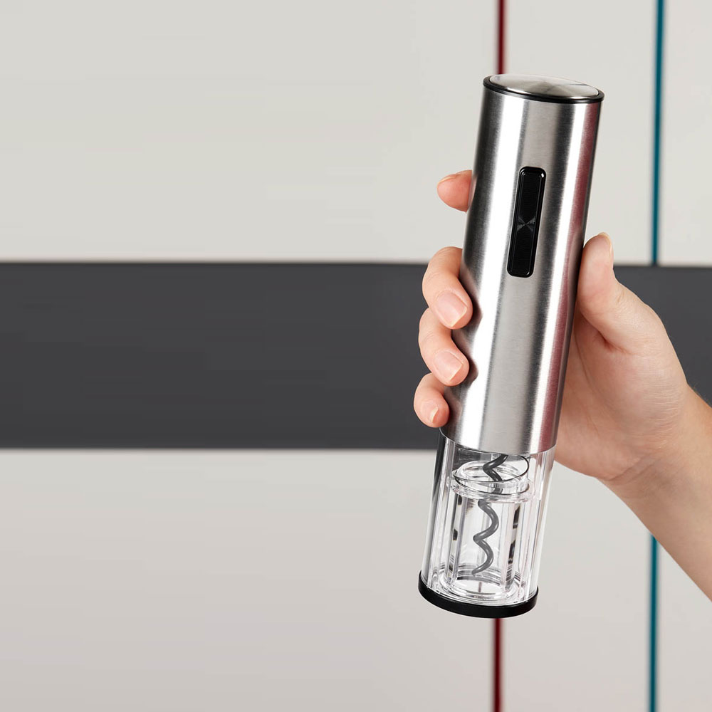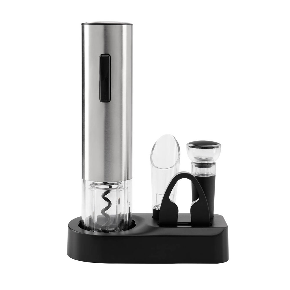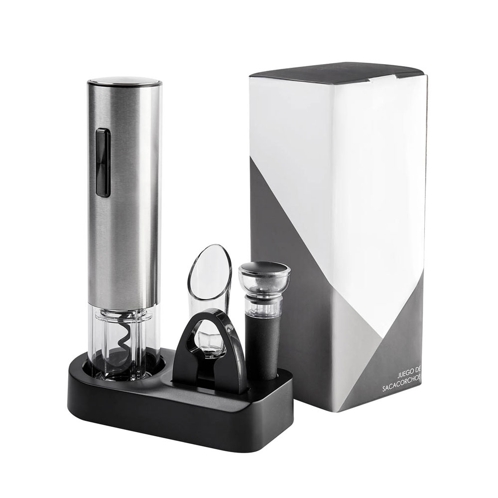 Set de sacacorchos eléctrico. Ideal para los amantes del vino. Contiene 1 sacacorchos con batería recargable y puerto tipo C, 1 cortador de papel aluminio, 1 vertedor para evitar salpicaduras, 1 tapón protector de vacío y 1 base para organizar los diferentes accesorios. Incluye cable auxiliar, manual de uso y caja individual.