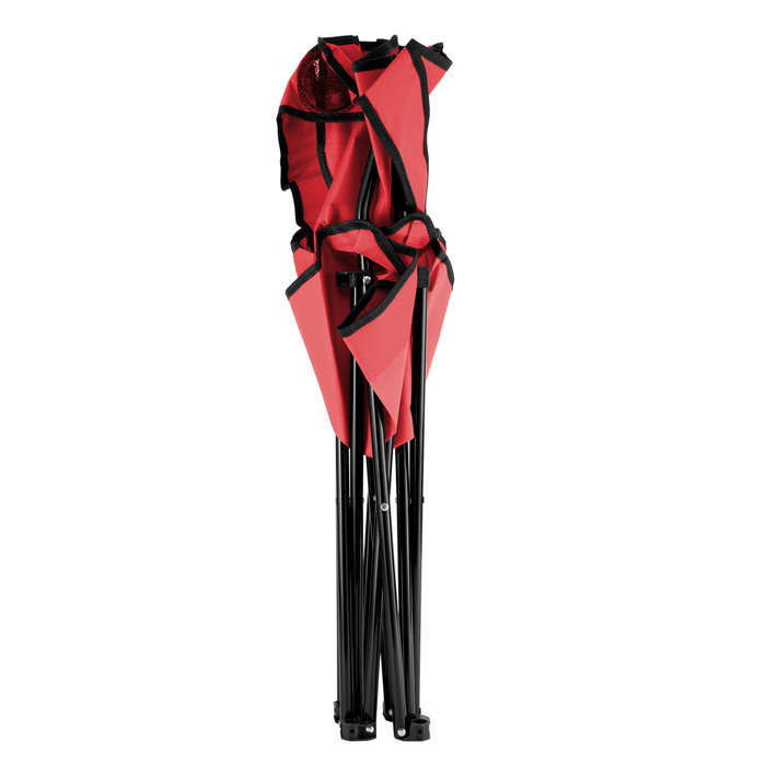 Silla Camping Director plegable con apoyabrazos. Estructura con tubos de hierro. Asiento y apoyabrazos de poliéster600D con revestimiento de PVC y costuras reforzadas. Incluye red portabotellas color negro. Funda del mismo color con cierre ajustable y correa color negro para su mejor traslado.