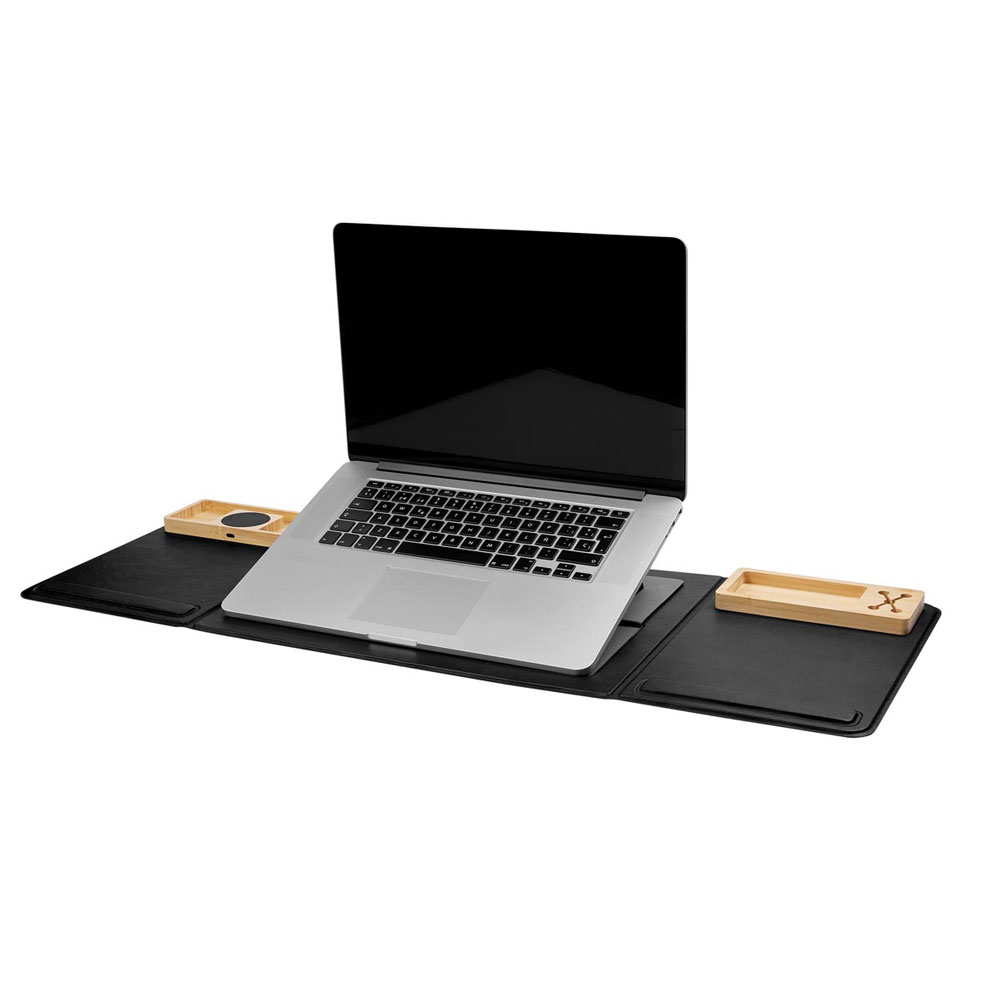 Mouse pad multifuncion dividido en 3 secciones que permite una mejor organización. Las solapas laterales están imantadas para poderse plegar y guardar sin utilizar mucho espacio. Incluye dos organizadores de bambú: uno con espacio para boligrafos y otro con cargador inalámbrico de 15W (Carga rápida) para smartphone y luz LED. El logo enciende al grabar. Ambos organizadores tienen la base imantada que permite moverlos y fijarlos del lado que mas te convenga. En la sección intermedia cuenta con un soporte para laptop plegable a dos posiciones. Incluye cable auxiliar USB con conector tipo C. El bambú es un producto natural el cual puede presentar variaciones en tonalidades y vetas.
