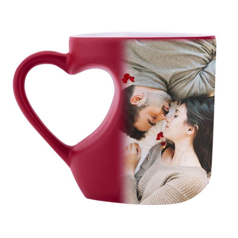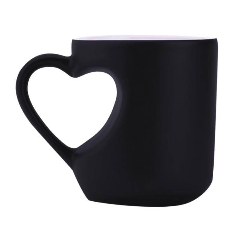 Taza mágica de sublimación con asa en forma de corazón. El diseño aparece al servir agua caliente. CAP. 300 ml. (10 OZ). Temperatura y Tiempo sugeridos para sublimar: 190 grados / 120 seg. Venta en múltiplos de 12.