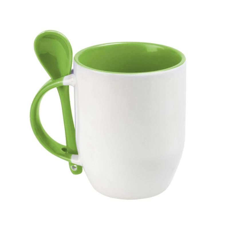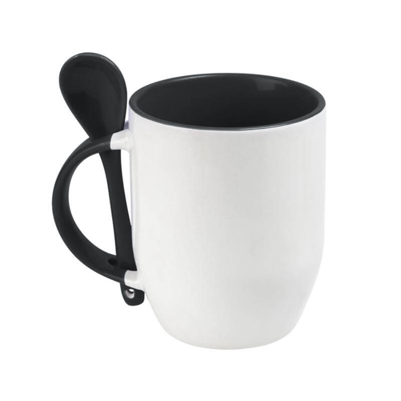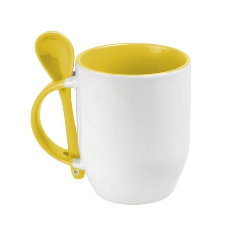 Taza para sublimación con cuchara, asa e interior de color. CAP. 350 ml. (12 OZ). Presentación: Caja en color blanco.