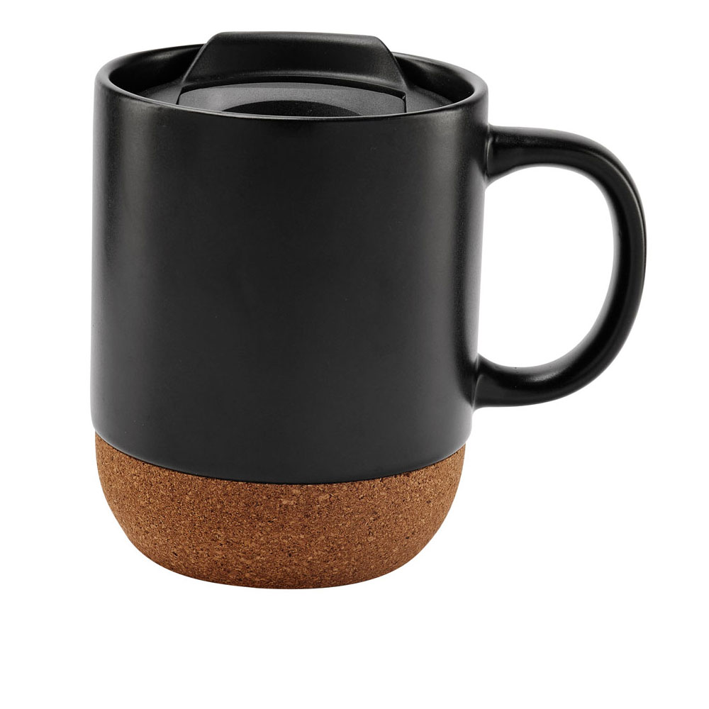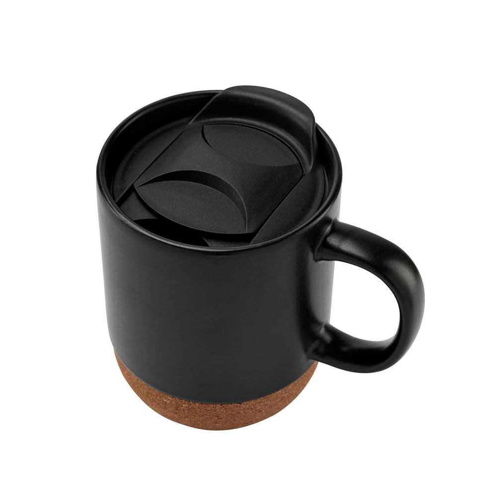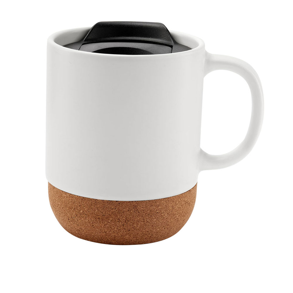 Taza de cerámica terminado mate. Base de corcho. Incluye tapa de plástico con válvula de seguridad.