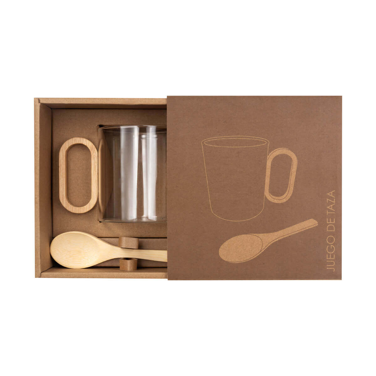 Taza de vidrio con asa de bambú. Su diseño minimalista combina materiales naturales con una estética moderna. Incluye una cuchara de bambú ideal para café, té o infusiones, todo presentado en un empaque kraft que realza su esencia orgánica. Capacidad de 13 Oz.