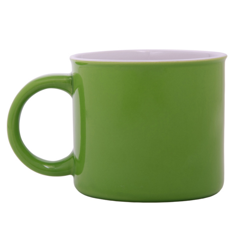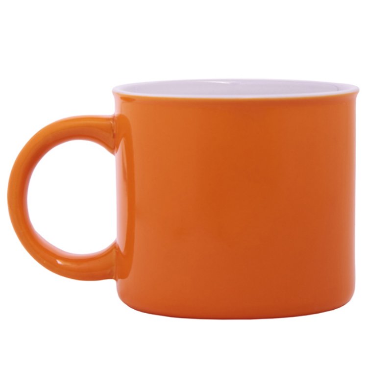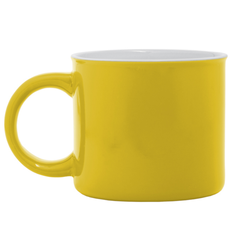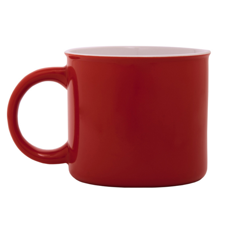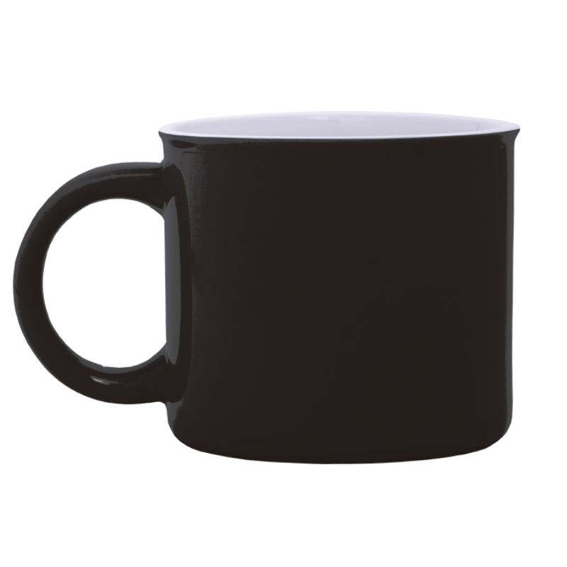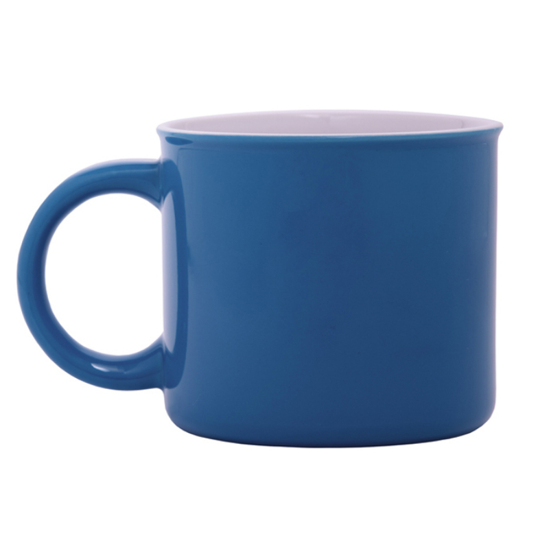 Taza de cerámica bicolor acabado brillante de boca abierta, interior color blanco. CAP. 15 OZ. Venta caja cerrada en múltiplos de 36 pzs por color.