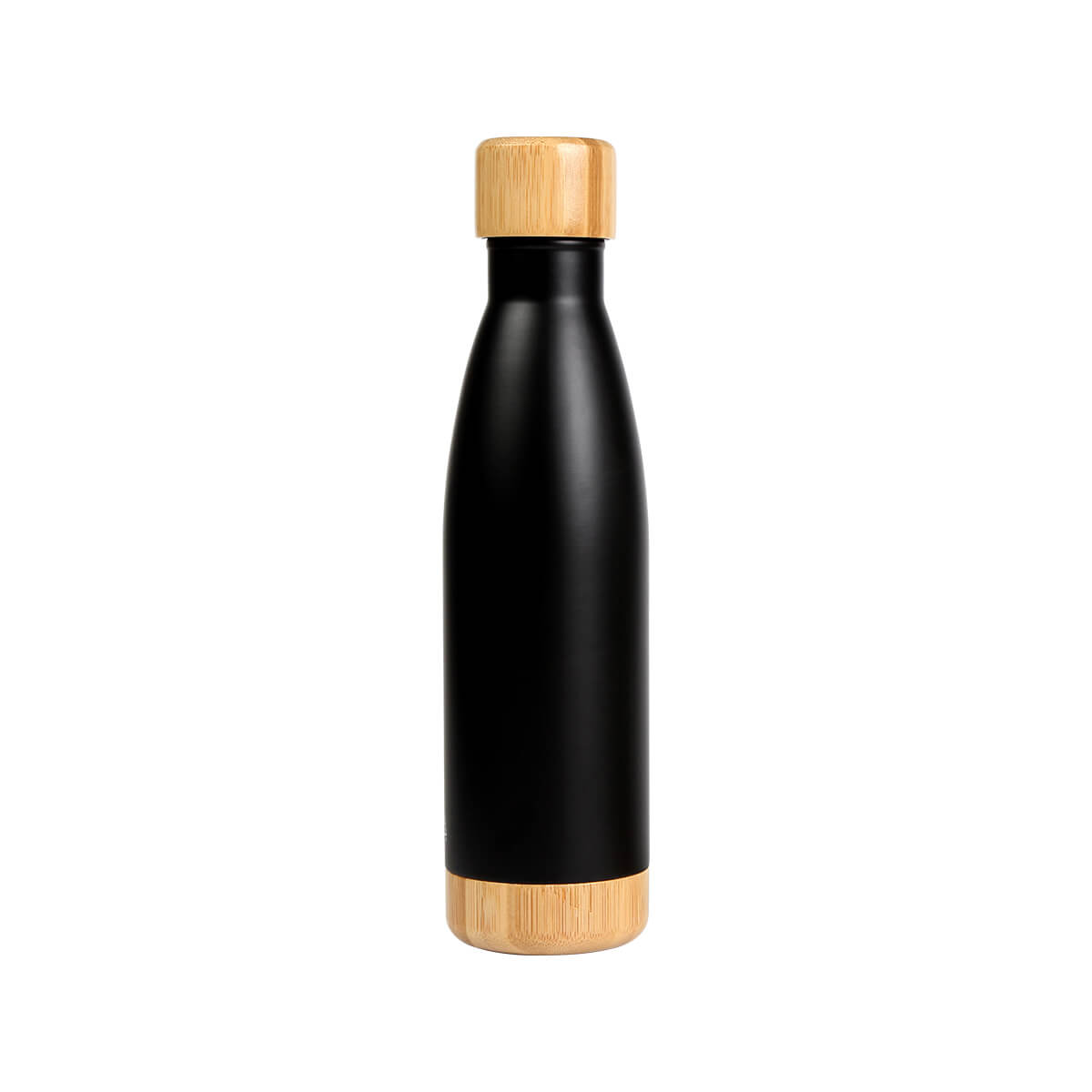 Botella plateada fabricada en acero inoxidable reciclado doble pared con tapa de rosca fabricada en bambú y detalles en la base del mismo material. Capacidad de 600 ml, es una opción sostenible y elegante para mantener tus bebidas frías o calientes mientras contribuyes al cuidado del medio ambiente. No usar en microondas, incluye caja individual
