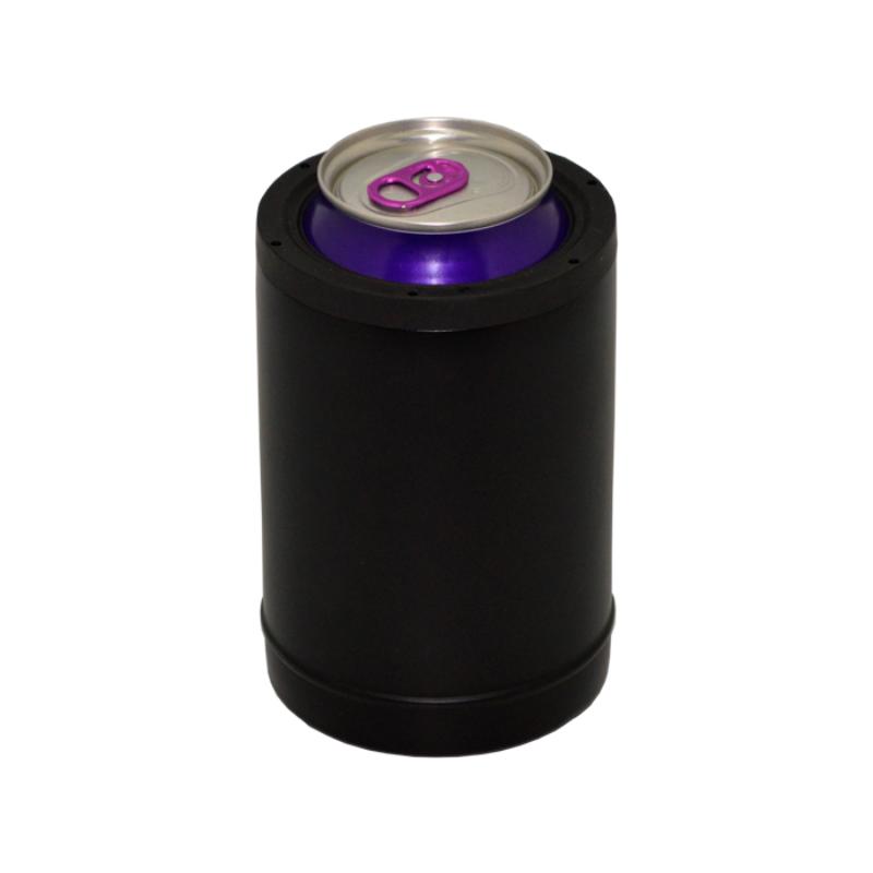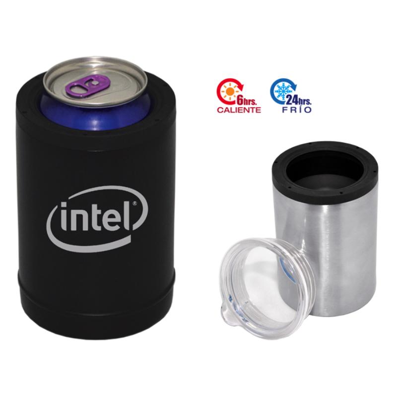 Termo y porta lata de acero inoxidable 304, con doble pared insulada al alto vacío para preservación de frío por 24 hrs. y calor por 6 hrs. Por medio de la tapa de rosca tipo anillo en negro, se puede sujetar la lata, para evitar que se resbale. Para bebidas calientes, cuenta con una segunda tapa de rosca color transparente. CAP. 360 ml. Presentación: caja en color blanco.