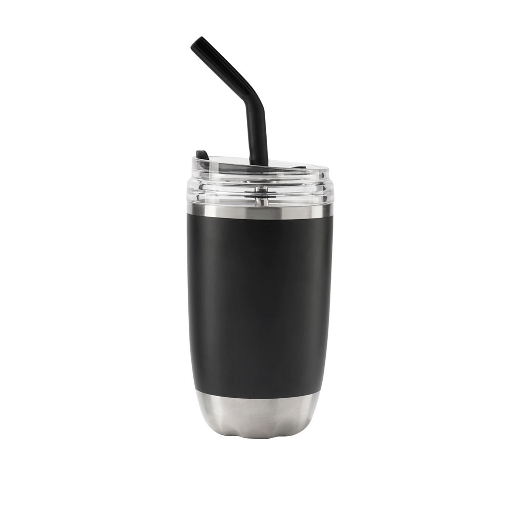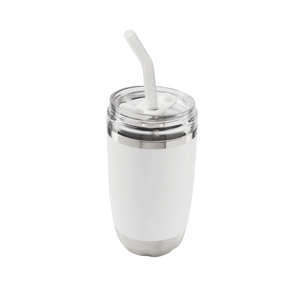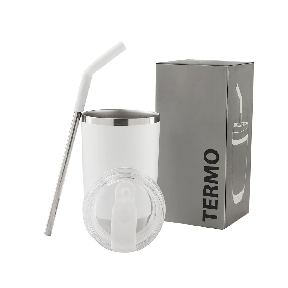 Doble pared. Cerrado al vacío. Pared interna y externa de acero inoxidable. Tapa push de plástico con sobretapa de silicon removible y ranura especial con tapón para popote. Incluye popote metálico con boquilla de silicon. Mantiene temperatura caliente 2 hrs y temperatura fria 8 hrs. Caja individual incluida.
