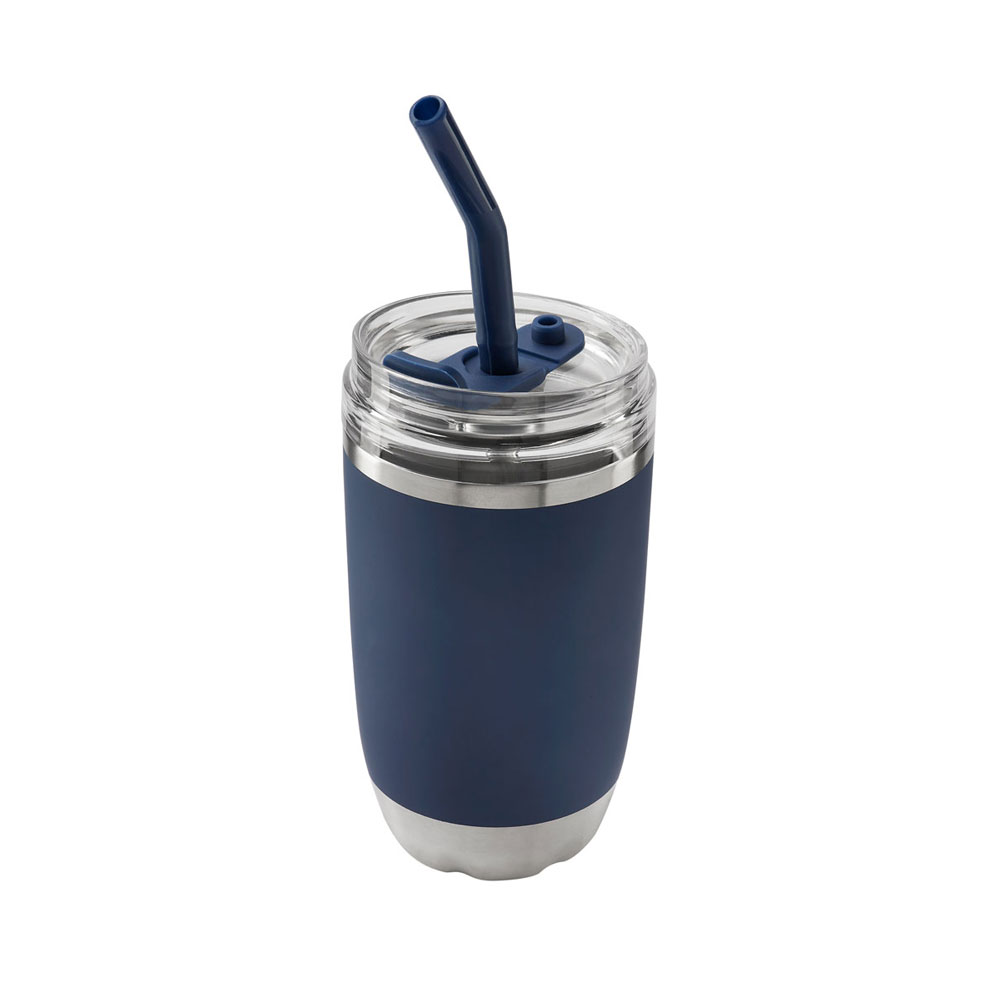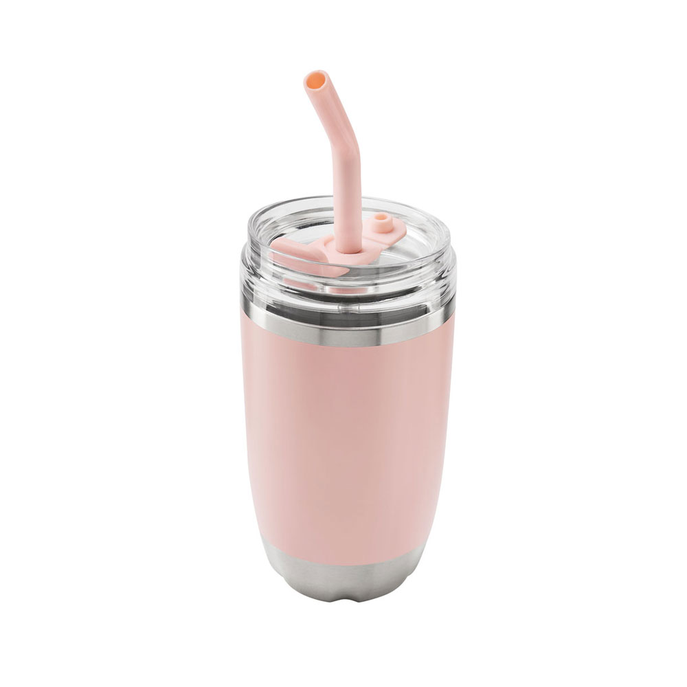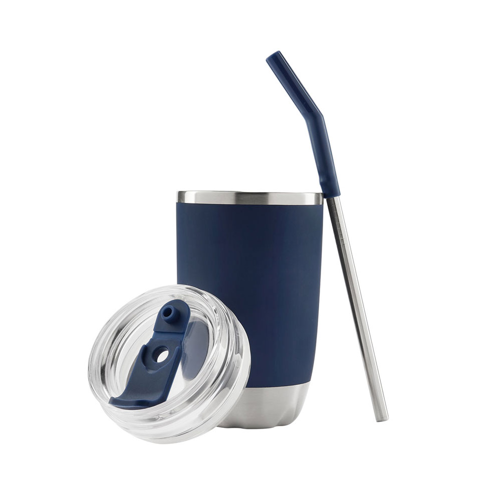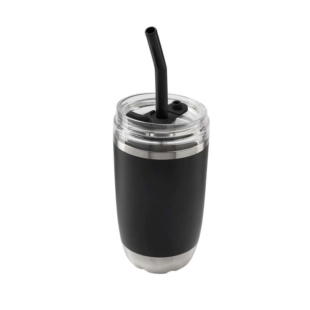 Doble pared. Cerrado al vacío. Pared interna y externa de acero inoxidable. Tapa push de plástico con sobretapa de silicon removible y ranura especial con tapón para popote. Incluye popote metálico con boquilla de silicon. Mantiene temperatura caliente 2 hrs y temperatura fria 8 hrs. Caja individual incluida.