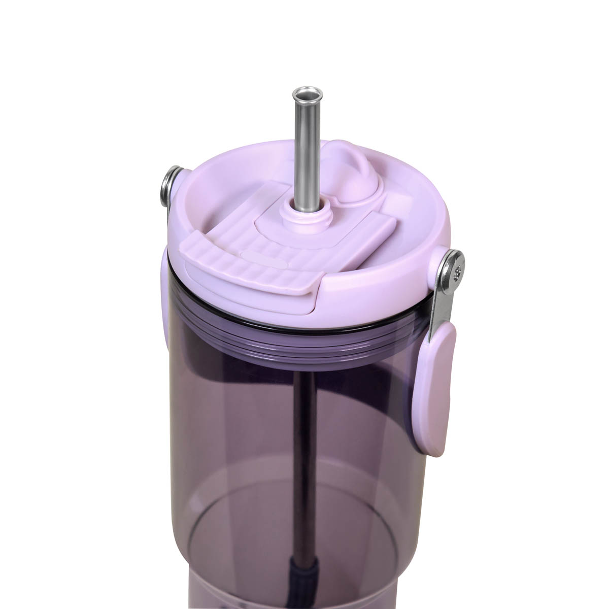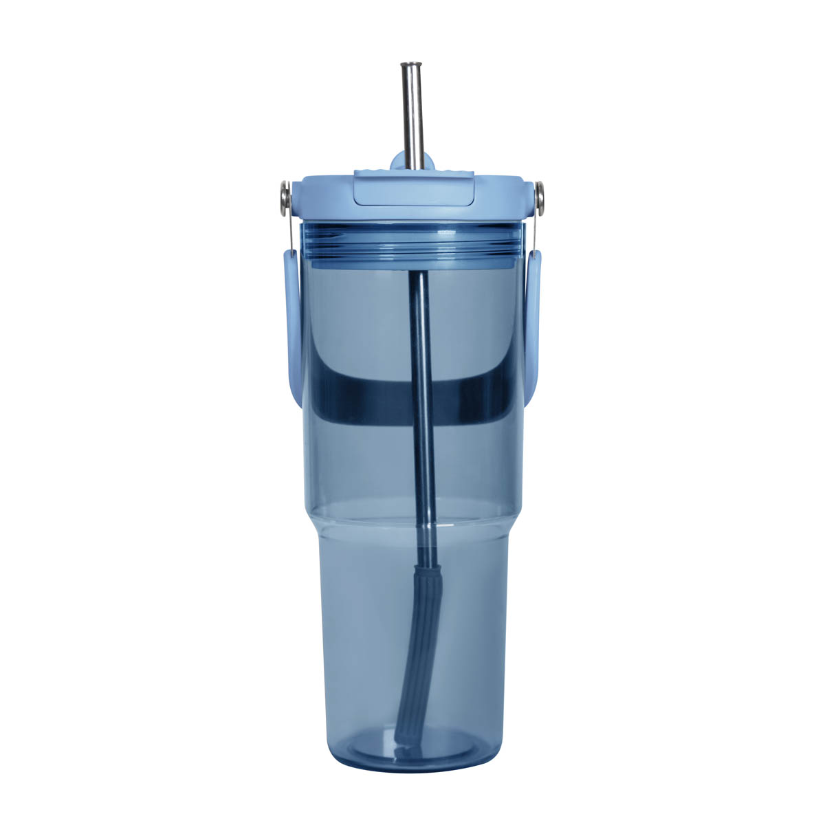Termo de plástico de una pared. Incluye tapa con cierre de rosca que ofrece dos alternativas de uso,  sobretapa con sistema push y ranura especial para popote con  aditamento para cerrar y evitar derrames. Incluye popote metálico que cuenta con un mecanismo de salida automática, gracias a su base de silicón que lo eleva al abrir el compartimento. Además, su práctica asa plegable, permite llevarlo comodamente a cualquier  lugar. Capacidad 28 Oz. Base de 7 cm de diámetro. Incluye caja individual.