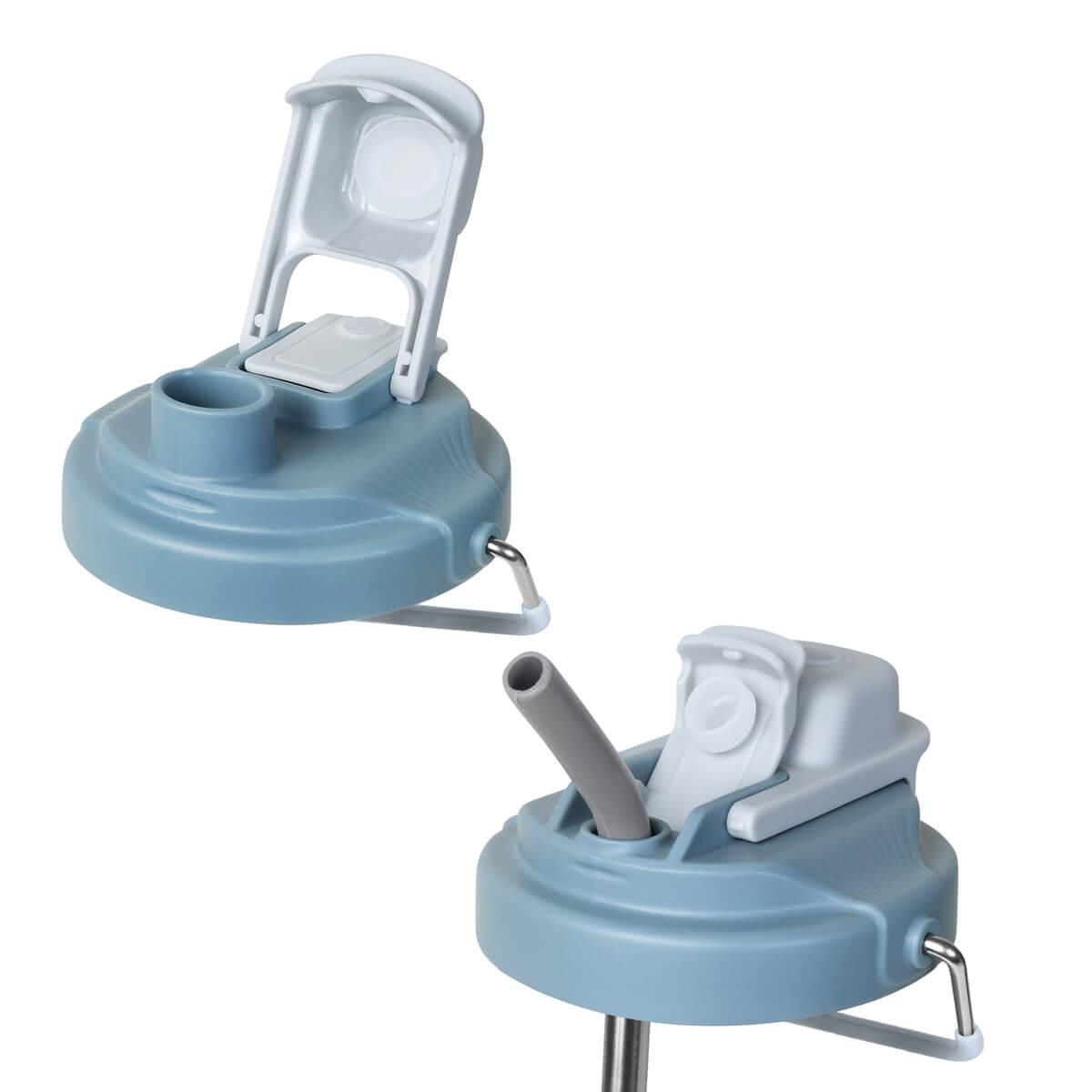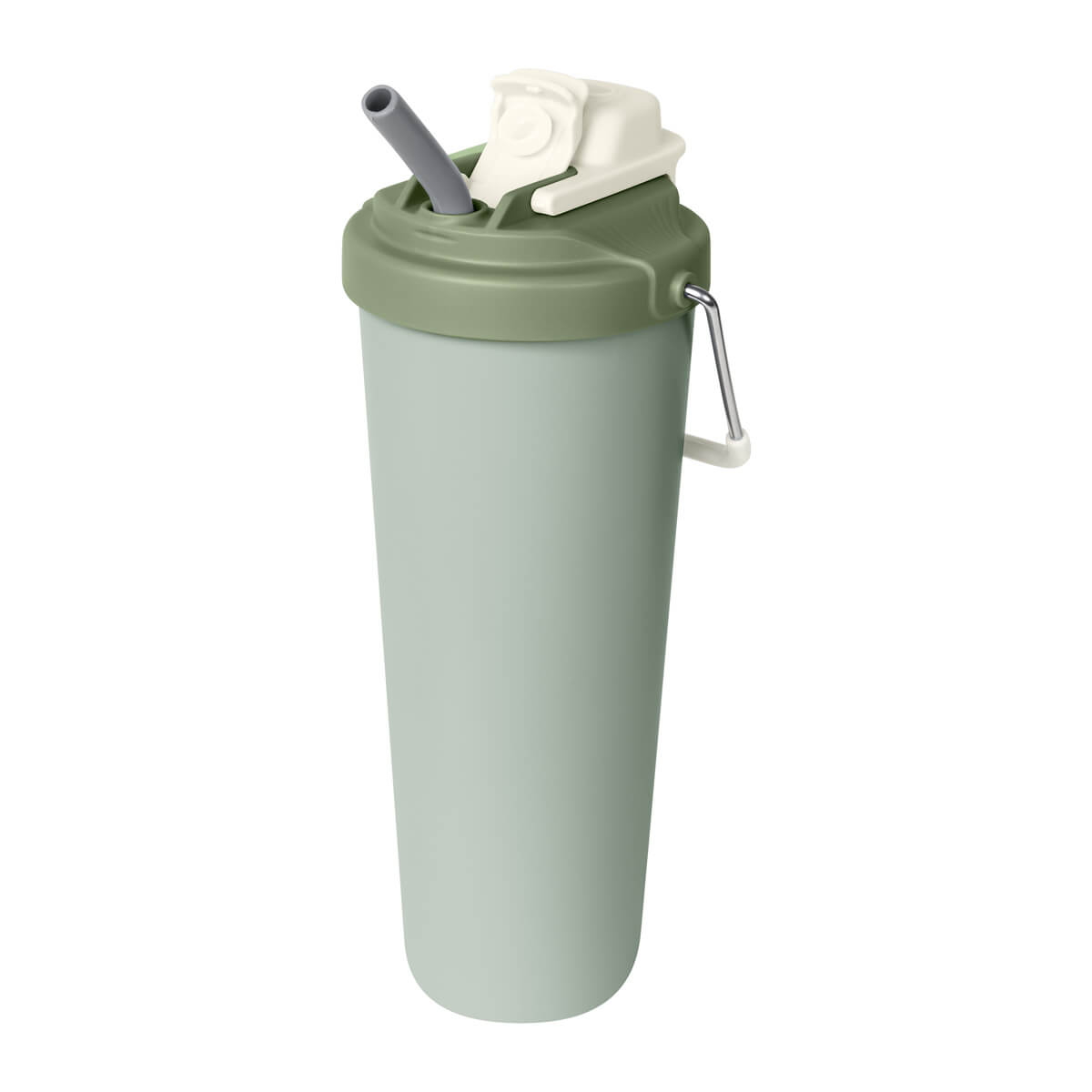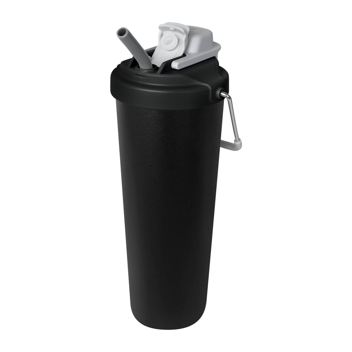 Termo doble pared. Cerrado al vacío. Pared interna y externa acero inoxidable. Cuerpo con terminado rugoso. Tapa de plástico con sistema de rosca y doble sobretapa con cierre push, una con boquilla para beber y otra con ranura para popote. Agrega un asa metálica con recubrimiento de silicon para llevarlo contigo a todos lados. Mantiene la temperatura caliente por 4 hrs y la temperatura fria por 8 hrs. Capacidad de 25 Oz. Base de 7 cm de diámetro. Incluye caja individual.