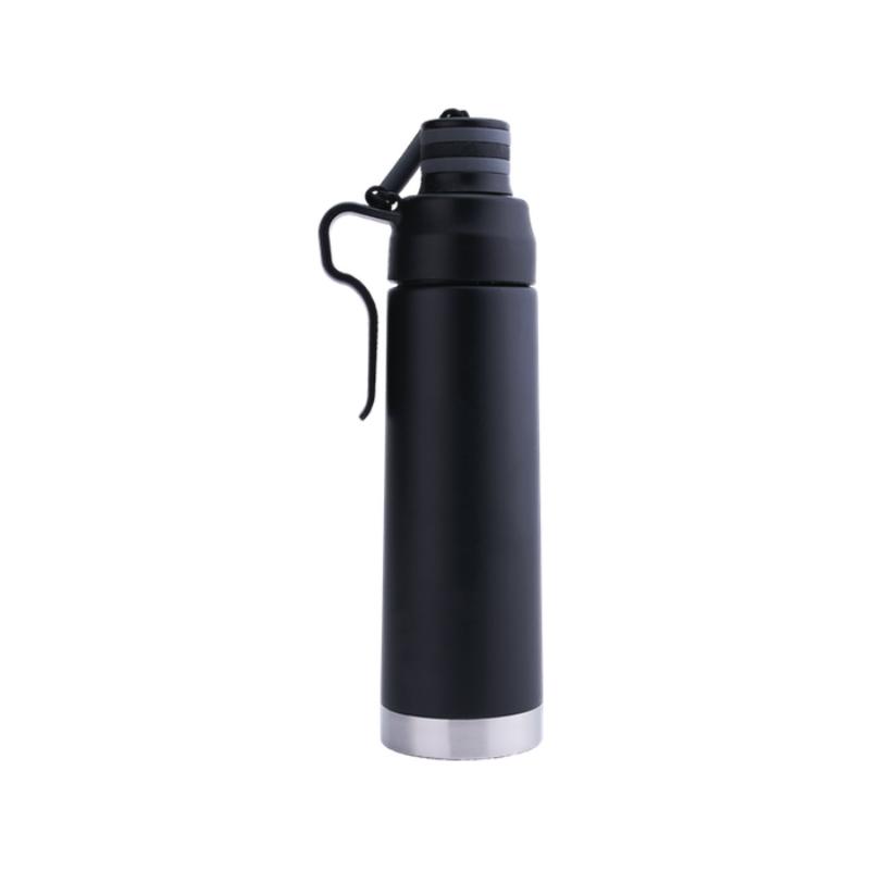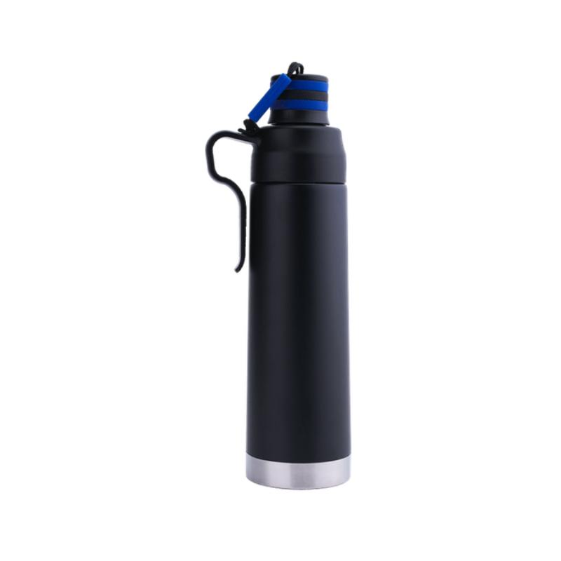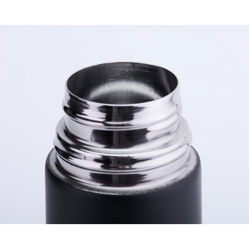 Termo de acero inoxidable con acabado mate y practica asa metálica para sujetarlo fácilmente o para colgar en la mochila. Cuenta con boquilla para tomar cómodamente las bebidas y con tapa de rosca amplia para vaciar líquidos fácilmente. El diseño tiene detalles decorativos con banda y correa de silicón en color. CAP. 540 ml. Presentación: Caja en color blanco.