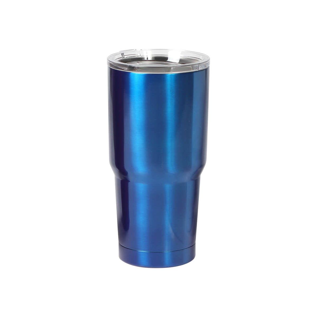Vaso de acero inoxidable doble pared con tapa transparente de plástico, fabricado en materiales de grado alimenticio, mantiene bebidas frías o calientes por un largo tiempo, no usar en microondas. Capacidad de 600 ml (20 oz). Incluye caja de cartón individual. Azul, blanco y rojo con acabado brillante y negro con acabado mate.