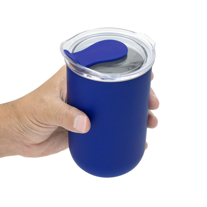 Mug doble Pared. Interior de acero inoxidable 304 y exterior de polipropileno. Pintura acabado mate. Tapa plástica transparente a presión con anillo de silicona y cierre de silicona a tono con el color del cuerpo.