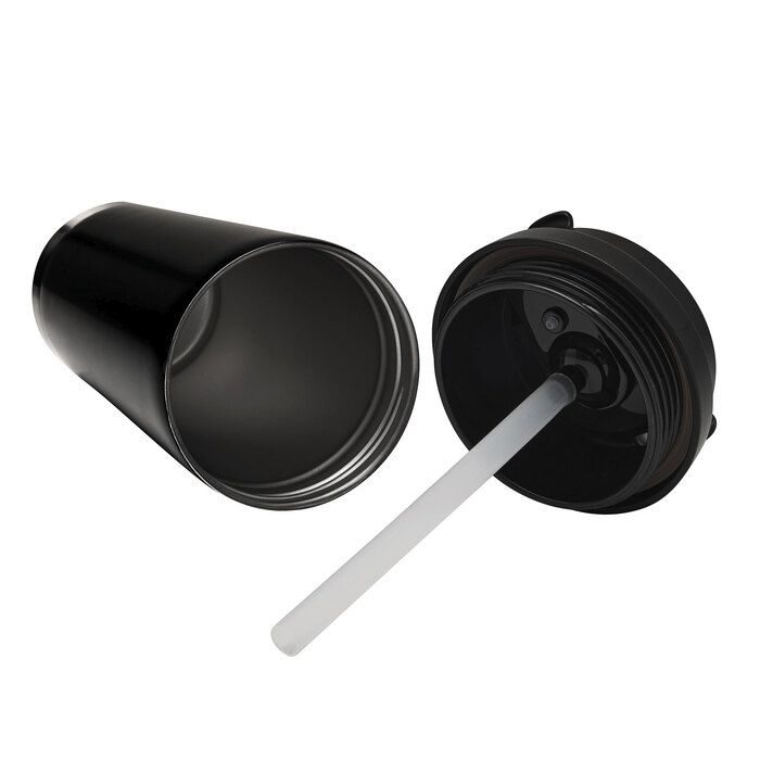 Termo mug doble pared, sellado al vacío. Interior en acero 304 y exterior en acero 201. Tapa de polipropileno a rosca y anillo de silicona, 2 en 1, con popote de polietileno incorporado, seguro antiderrame a presión y correa de poliéster.